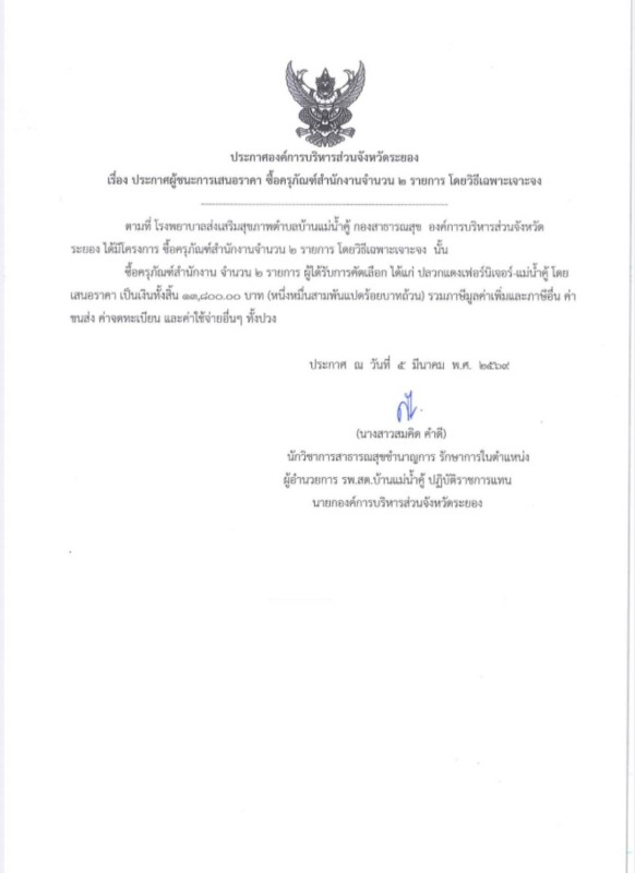 รพ.สต.บ้านแม่น้ำคู้ > ประกาศจัดซื้อจัดจ้าง ประกาศผู้ชนะการเสนอราคาซื้อครุภัณฑ์สำนักงาน จำนวน 2 รายการ โดยวิธีเฉพาะเจาะจง