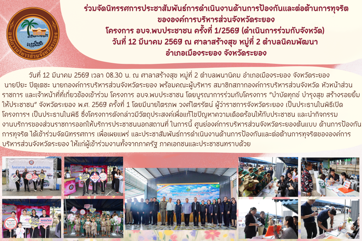 การประชาสัมพันธ์การดำเนินงานด้านการป้องกันและต่อต้านการทุจริต ของ อบจ.ระยอง โครงการ อบจ.พบประชาชน ครั้งที่ 1/2569 (ดำเนินการร่วมกับจังหวัด)