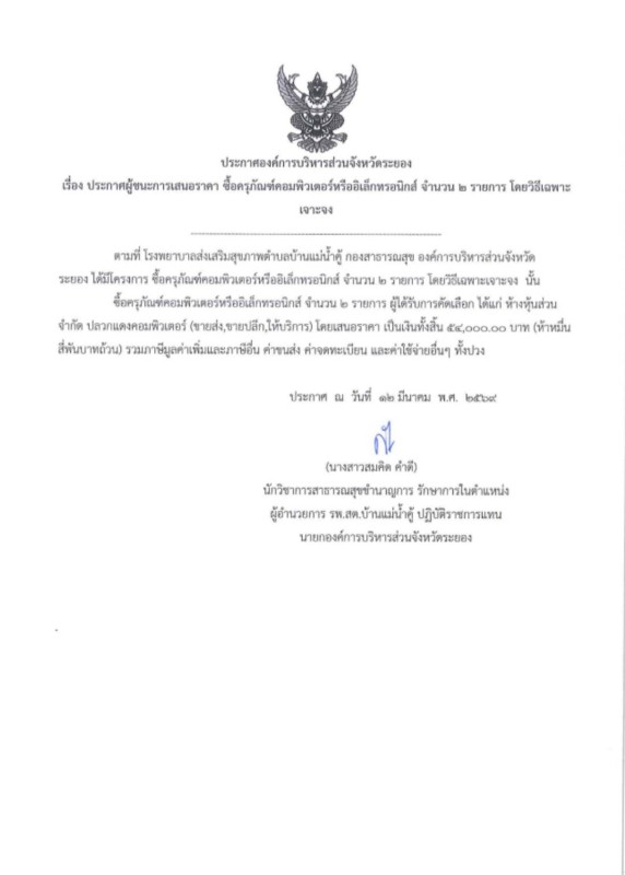 ประกาศผู้ชนะการเสนอราคา ซื้อครุภัณฑ์คอมพิวเตอร์หรืออิเล็กทรอนิกส์ จำนวน ๒ รายการ โดยวิธีเฉพาะเจาะจง