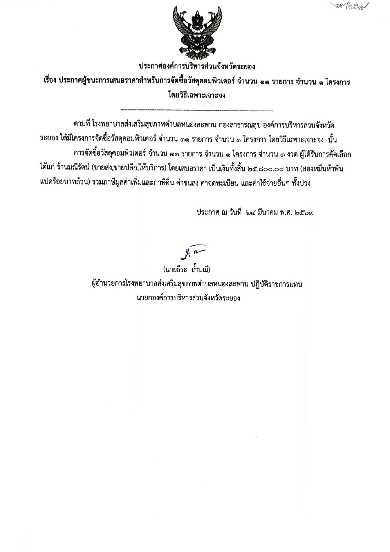 ประกาศผู้ชนะการเสนอราคา สำหรับการจัดจ้างเหมาซ่อมคอมพิวเตอร์สำนักงาน