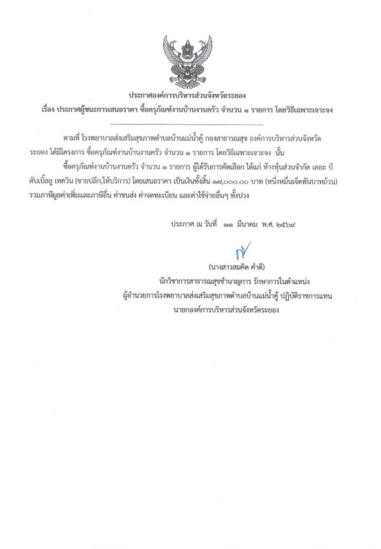 ประกาศผู้ชนะการเสนอราคา ซื้อครุภัณฑ์งานบ้านงานครัว จำนวน 1 รายการ โดยวิธีเฉพาะเจาะจง