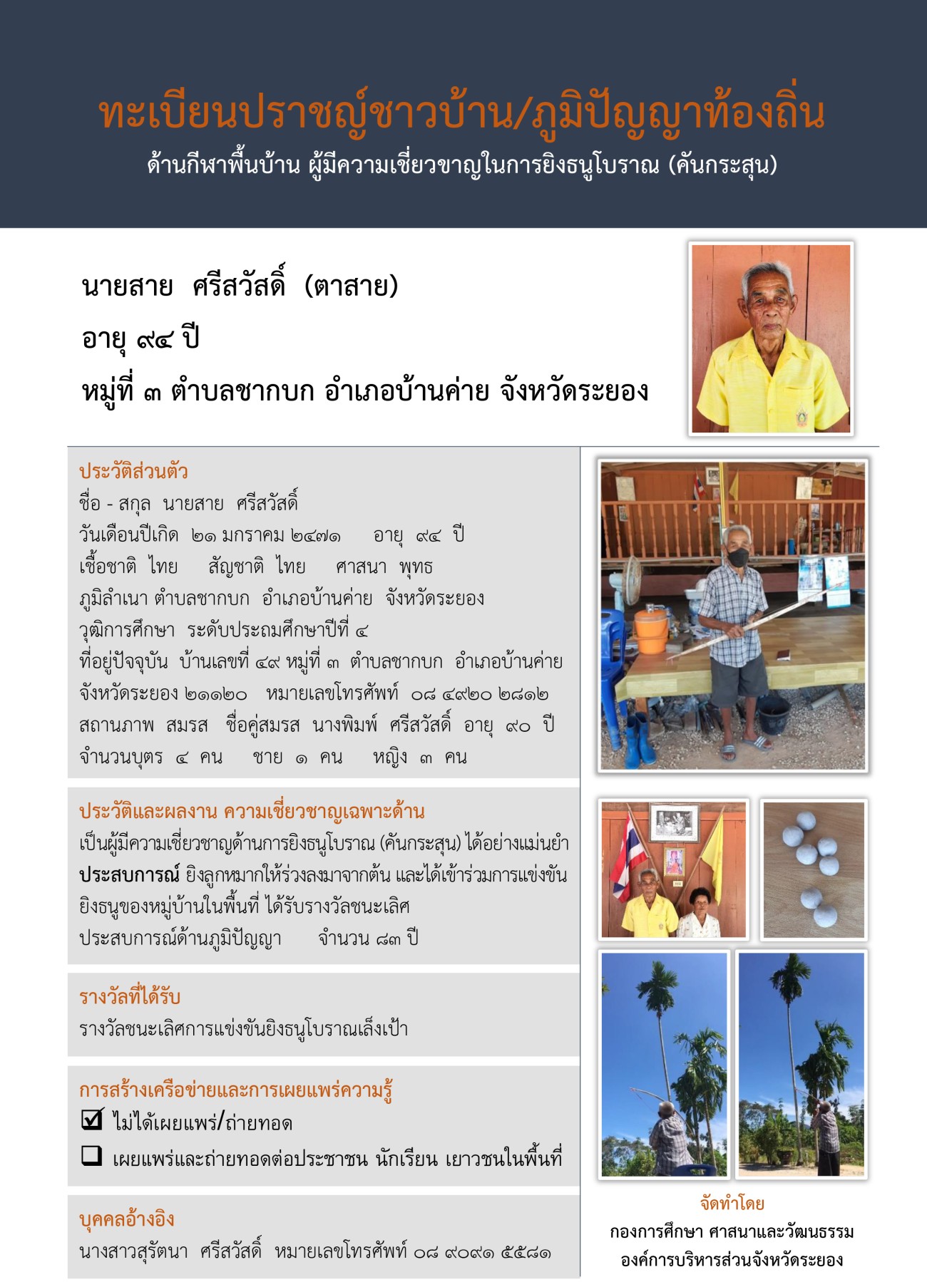 1. ด้านกีฬาพื้นบ้าน ผู้มีความเชี่ยวชาญในการยิงธนูโบราณ (คันกระสุน)