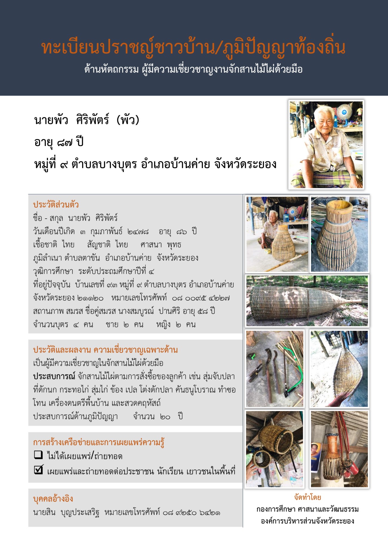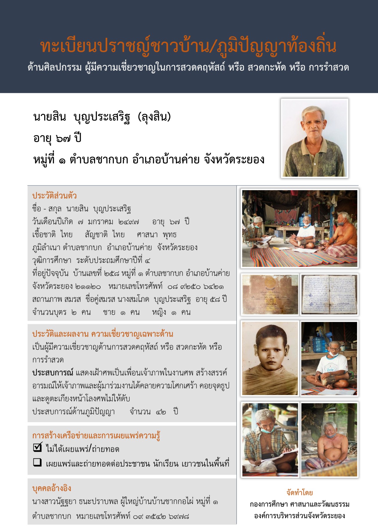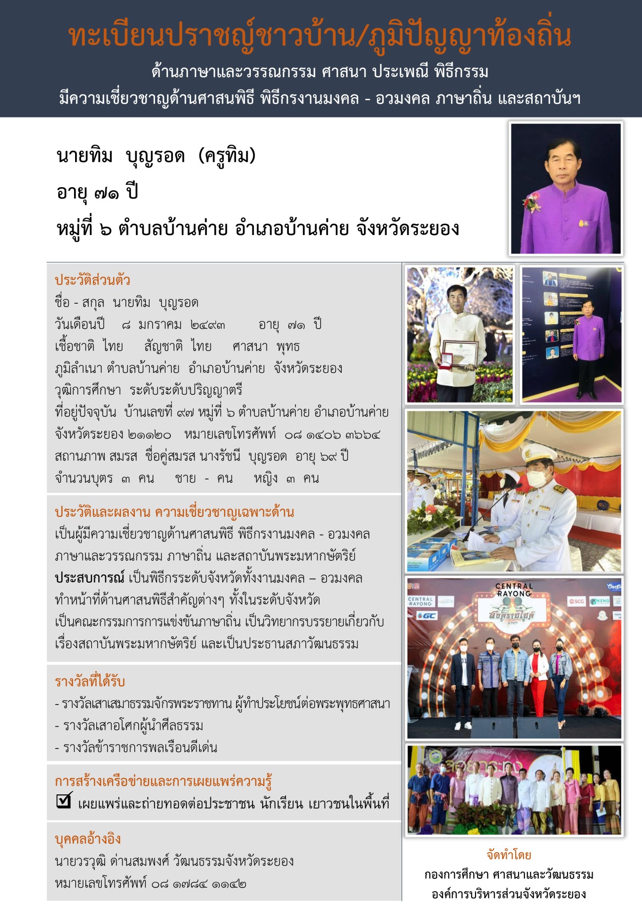 กองการศึกษา ศาสนาและวัฒนธรรม ได้จัดทำทะเบียนปราชญ์ชาวบ้าน/ภูมิปัญญาท้องถิ่นขึ้น เพื่อนำไปเผยแพร่ให้เกิดประโยชน์กับเด็ก เยาวชน ชุมชน ประชาชนในจังหวัดระยอง และประชาชนทั่วไป ได้ศึกษา เรียนรู้ต่อยอด สืบสาน อนุรักษ์ภูมิปัญญาท้องถิ่นที่สำคัญและมีประโยชน์ไว้ไม่ให้สูญหายไปจากจังหวัดระยอง