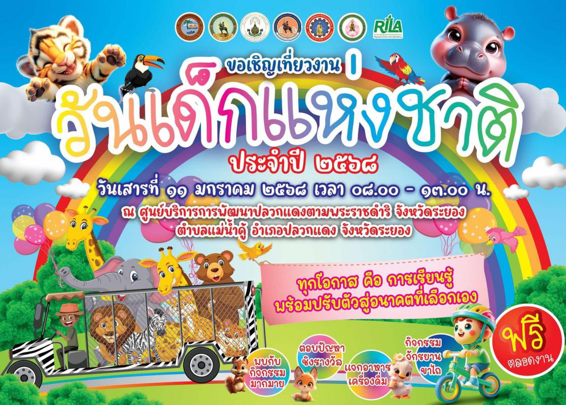 องค์การบริหารส่วนจังหวัดระยอง ขอเชิญเที่ยวงานวันเด็กแห่งชาติ ประจำปี ๒๕๖๘ ณ ศูนย์บริการการพัฒนาปลวกแดงตามพระราชดำริ จังหวัดระยอง (อ่างเก็บน้ำดอกกราย)
