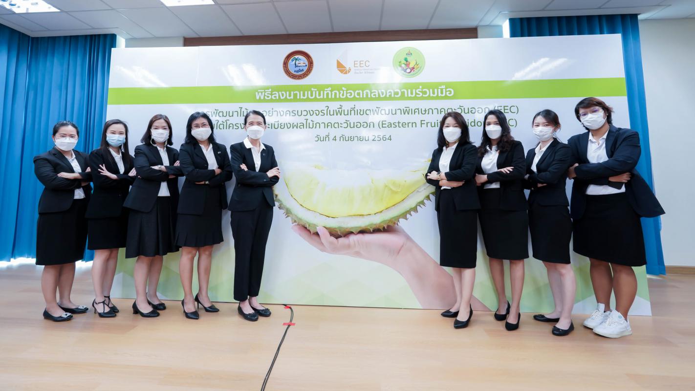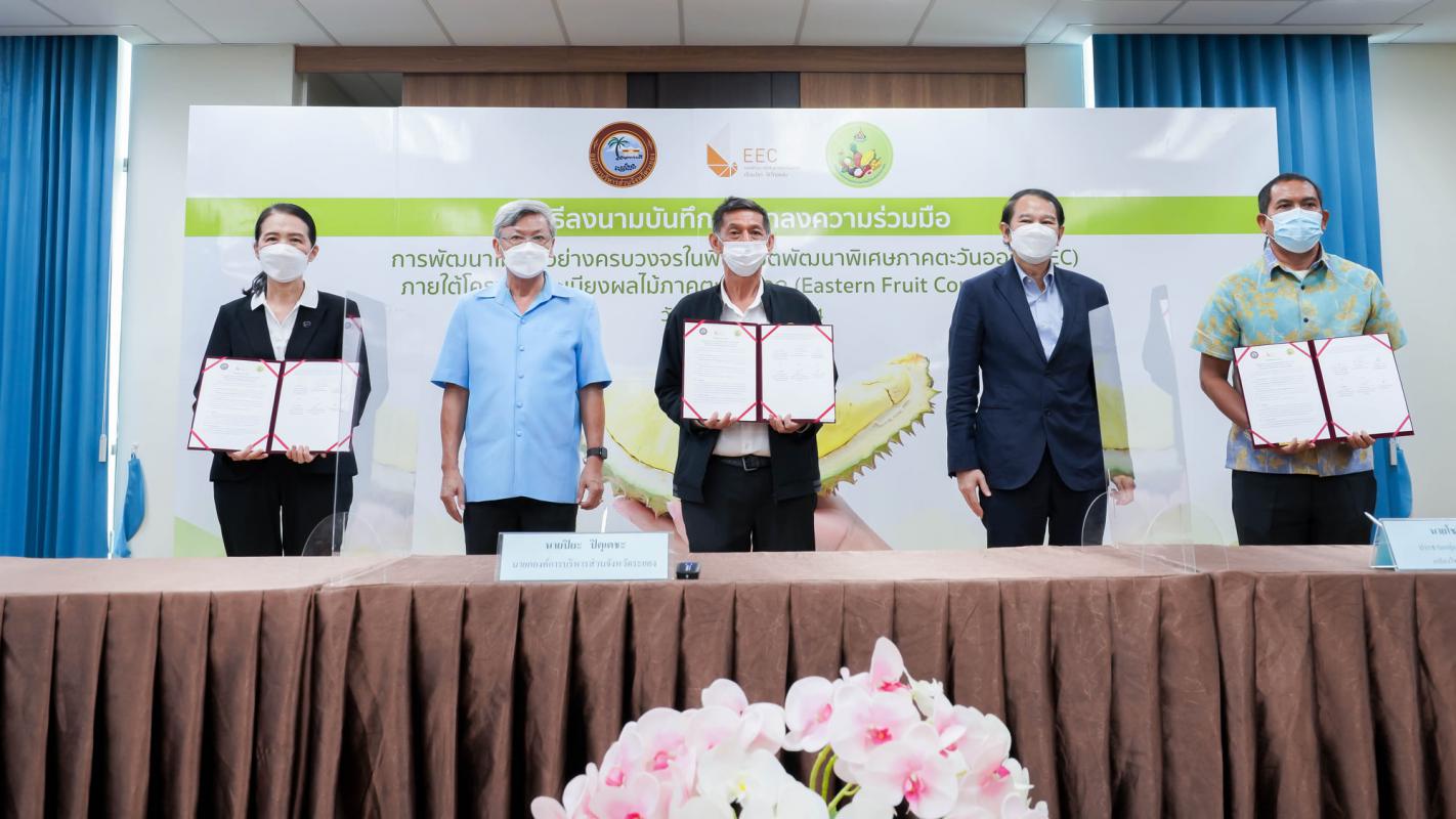 (อีอีซี) ภายใต้โครงการระเบียงผลไม้ภาคตะวันออก (Eastern Fruit Corridor : EFC) และแผนพัฒนาการเกษตรในพื้นที่เขตพัฒนาพิเศษภาคตะวันออก โดยมี นางสาวพจณี อรรถโรจน์ภิญโญ รองเลขาธิการคณะกรรมการนโยบายเขตพัฒนาพิเศษภาคตะวันออก (สกพอ.) นายปิยะ ปิตุเตชะ นายกองค์การบริหารส่วนจังหวัดระยอง (อบจ.ระยอง) และนายโชติชัย บัวดิษ ประธานเครือข่ายวิสาหกิจชุมชนแปลงใหญ่ไม้ผลจังหวัดระยอง ร่วมลงนาม