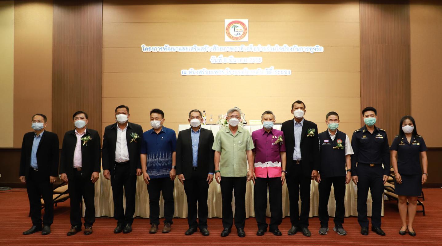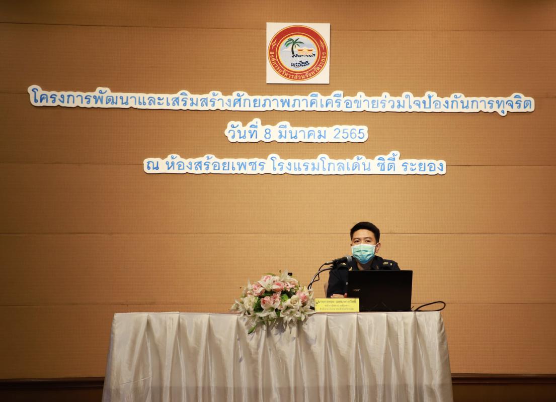 วันที่ 8 มีนาคม 2565 เวลา 09.00 น. นายชาญนะ เอี่ยมแสง ผู้ว่าราชการจังหวัดระยอง เป็นประธานเปิดโครงการพัฒนาและเสริมสร้างศักยภาพภาคีเครือข่ายร่วมใจป้องกันการทุจริต พร้อมด้วย นายประสานต์ พฤกษาชาติ รองนายกองค์การบริหารส่วนจังหวัดระยอง, นายมนตรี ชนะชัยพิบูลวัฒน์ ที่ปรึกษานายกองค์การบริหารส่วนจังหวัดระยอง, นายสุรินทร์ แสงทอง รองปลัดองค์การบริหารส่วนจังหวัดระยอง, นายสมชาย รุ่งเรือง ท้องถิ่นจังหวัด, นายกชทอง เอกมหาสวัสดิ์ พนักงานไตสวนระดับกลางสำนักงาน ป.ป.ช ประจำจังหวัดระยอง, นางสาวกรองกานต์ ปานดำ พนักงานป้องกันการทุจริต ชำนาญการพิเศษสำนักงาน ป.ป.ช ประจำจังหวัดระยอง, นายธนกวีร์ ทาธรรม เจ้าพนักงานป้องกันการทุจริต ชำนาญการสำนักงาน ป.ป.ช ประจำจังหวัดระยอง, คณะผู้บริหาร หัวหน้าส่วนราชการ ผู้อำนวยการกอง ข้าราชการและผู้ที่เกี่ยวข้องเข้าร่วมโครงการอย่างพร้อมเพรียง ณ ห้องสร้อยเพชร โรงแรมโกเด้นซิตี้ระยอง