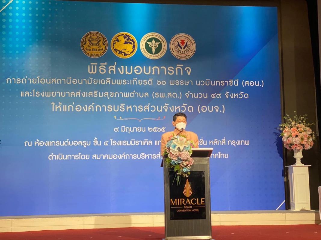 วันที่ 9 มิถุนายน 2565 เวลา 9.30 น. ณ โรงแรมมิราเคิล แกรนด์ คอนเวนชั่น หลักสี่ กรุงเทพมหานคร นายวิษณุ เครืองาม รองนายกรัฐมนตรี ประธานในพิธี และเป็นสักขีพยานในพิธีส่งมอบภารกิจถ่ายโอนสถานีอนามัยเฉลิมพระเกียรติ 60 พรรษา นวมินทราชินี (สอน.) และโรงพยาบาลส่งเสริมสุขภาพตำบล (รพ.สต.) ให้แก่องค์การบริหารส่วนจังหวัด จำนวน 49 จังหวัดโดยองค์การบริหารส่วนจังหวัดระยองมี นายกิตติ เกียรติ์มนตรี รองนายกองค์การบริหารส่วนจังหวัดระยอง (1) เข้าร่วมพิธีบันทึกการส่งมอบการถ่ายโอนภารกิจสถานีอนามัยเฉลิมพระเกียรติ 60 พรรษา นวมินทราชินีโรงพยาบาลส่งเสริมสุขภาพตำบลให้แก่องค์การบริหารส่วนจังหวัด ซึ่ง สำนักงานสาธารณสุขแต่ละจังหวัดจะเป็นผู้ส่งมอบให้กับองค์การบริหารส่วนจังหวัดนั้นๆ โดยจังหวัดระยอง มีนายแพทย์สุนทร เหรียญภูมิการกิจ นายแพทย์สาธารณสุขจังหวัดระยองเป็นผู้ส่งมอบ ซึ่งจะมีโรงพยาบาลส่งเสริมสุขภาพตำบล ถ่ายโอนมาองค์การบริหารส่วนจังหวัดระยอง รอบแรกจำนวน 40 แห่ง