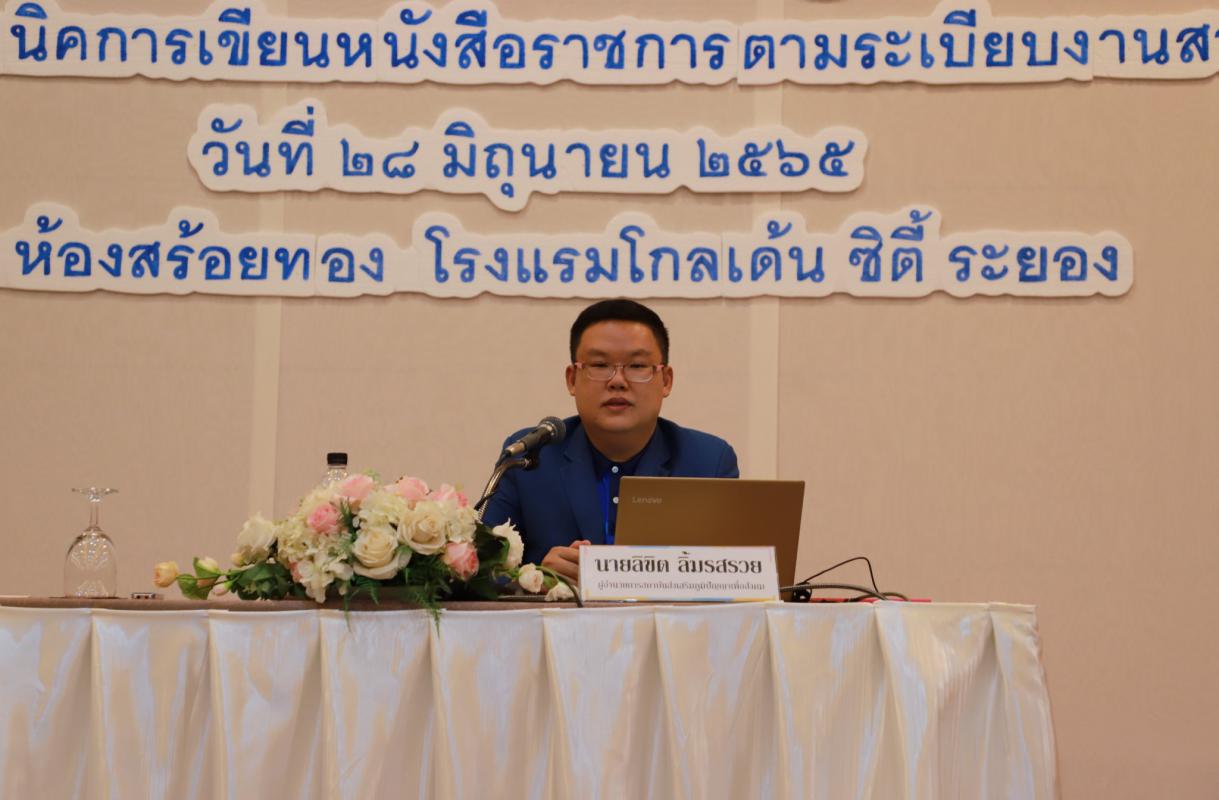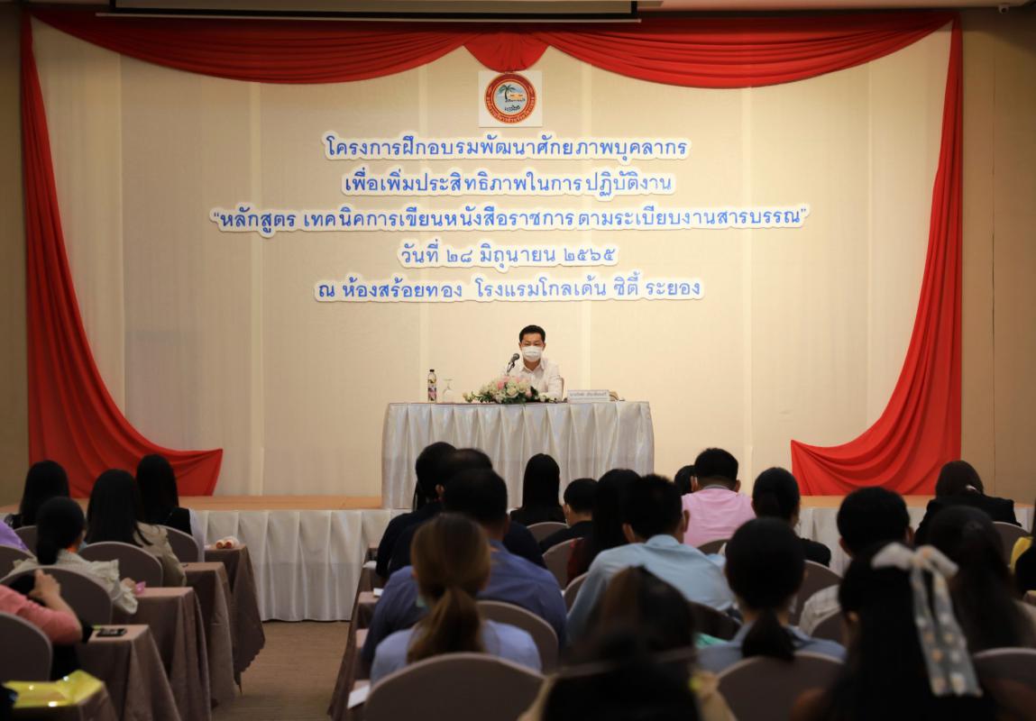 วันที่ 28 มิถุนายน 2565 เวลา 08.30 น. นายกิตติ เกียรติมนตรี รองนายกองค์การบริหารส่วนจังหวัดระยอง (1) เป็นประธานเปิดโครงการฝึกอบรมพัฒนาศักยภาพผู้บุคลากร เพื่อเพิ่มประสิทธิภาพในการปฏิบัติงาน หลักสูตรเทคนิคการเขียนหนังสือราชการตามระเบียบงานสารบรรณ โดยมี นางสุพรรณี สุขสันต์รุ่งเรือง ปลัดองค์การบริหารส่วนจังหวัดระยอง เป็นผู้กล่าวรายงาน พร้อมด้วย นายประสานต์ พฤกษาชาติ รองนายกองค์การบริหารส่วนจังหวัดระยอง (2), นายอรุณ วิชกิจ ผู้เชี่ยวชาญพิเศษด้านการวางแผนและการวิเคราะห์นโยบาย, คณะผู้บริหาร หัวหน้าส่วนราชการ และผู้ที่เกี่ยวข้องเข้าร่วมเปิดโครงการอย่างพร้อมเพรียง ณ ห้องสร้อยทอง โรงแรมโกลเด้น ซิตี้ ระยอง