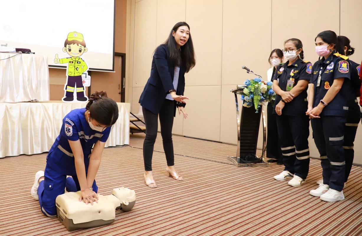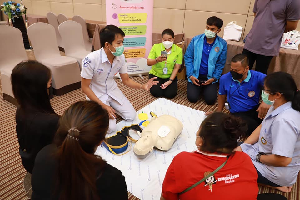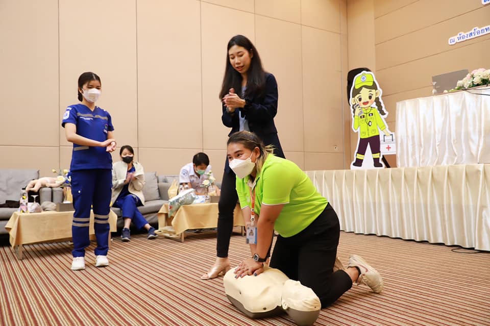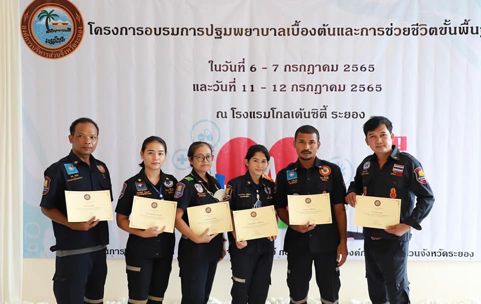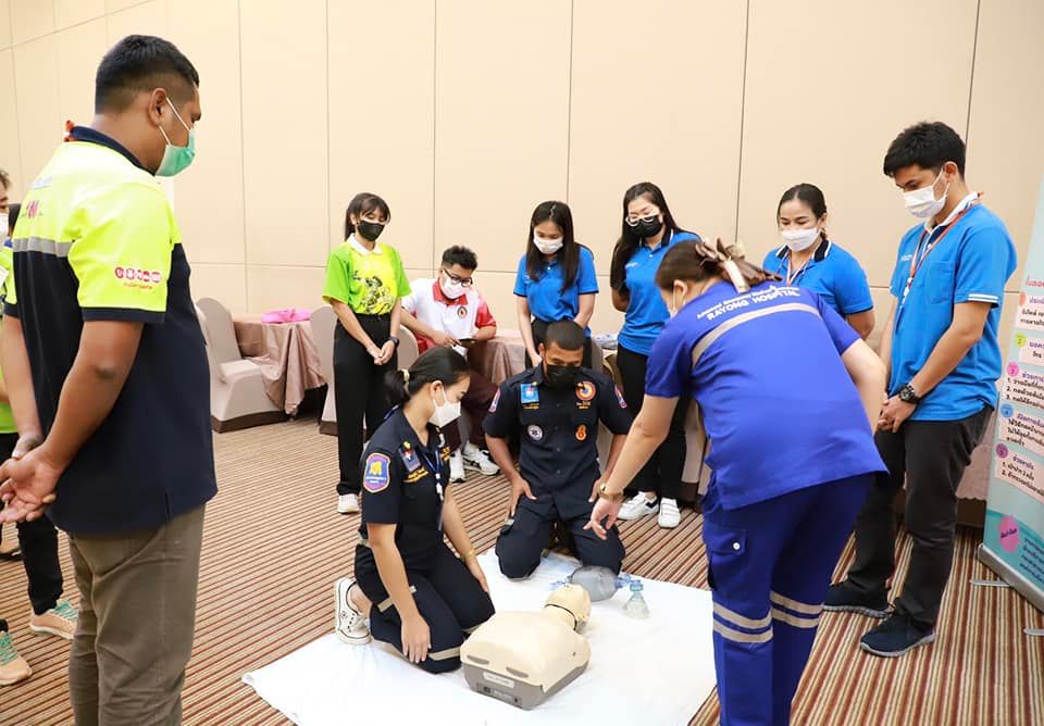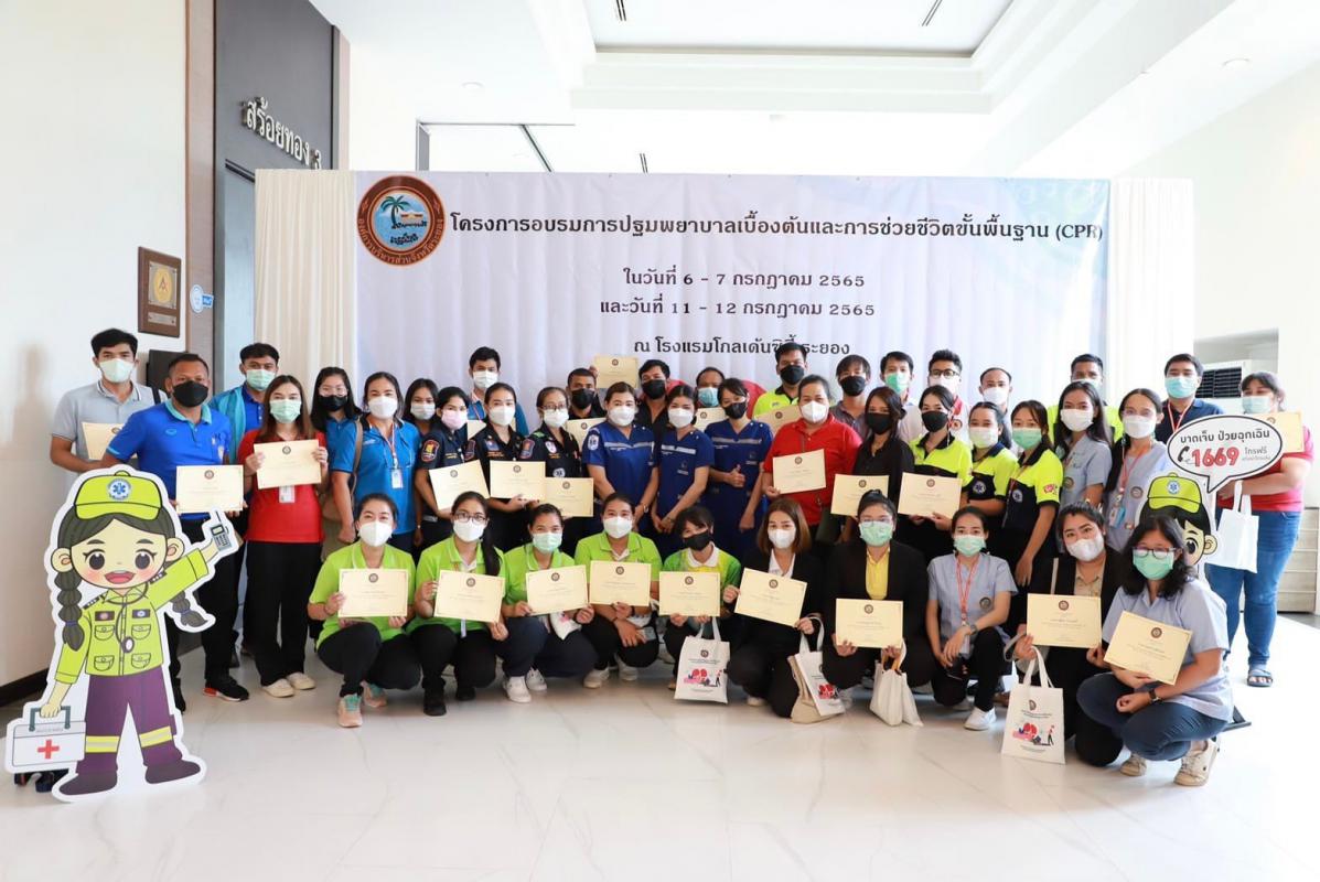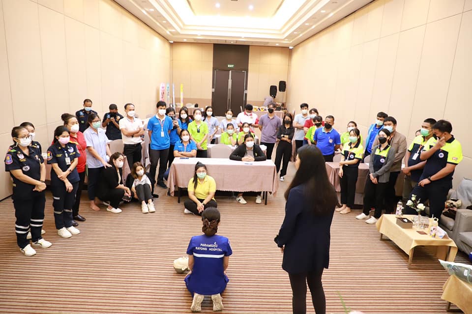 วันที่ 7 กรกฎาคม 2565 เวลา 9.00 น. กองสาธารณะสุข จัดโครงการอบรมปฐมพยาบาลเบื้องต้น และการช่วยชีวิตขั้นพื้นฐาน (CPR) รุ่นที่ 2 ณ ห้องสร้อยทอง โรงแรมโกลเด้น ซิตี้ ระยอง โดยในช่วงเช้าเป็นการรับฟังการบรรยายในหัวข้อ “การปฐมพยาบาลเบื้องต้น (First aid) และการช่วยชีวิตขั้นพื้นฐาน (BLS)” และฝึกปฏิบัติตามฐานในช่วงบ่ายจากแพทย์และทีมงานจากโรงพยาบาลระยอง ซึ่งโครงการในครั้งนี้จัดขึ้นเพื่อให้ผู้เข้าอบรมทุกท่านสามารถให้การปฐมพยาบาลเบื้องต้นและช่วยชีวิตขั้นพื้นฐาน (CPR) ได้อย่างถูกต้อง สามารถใช้เครื่องกระตุ้นไฟฟ้าหัวใจอัตโนมัติในการช่วยเหลือผู้ที่เจ็บป่วยฉุกเฉินได้