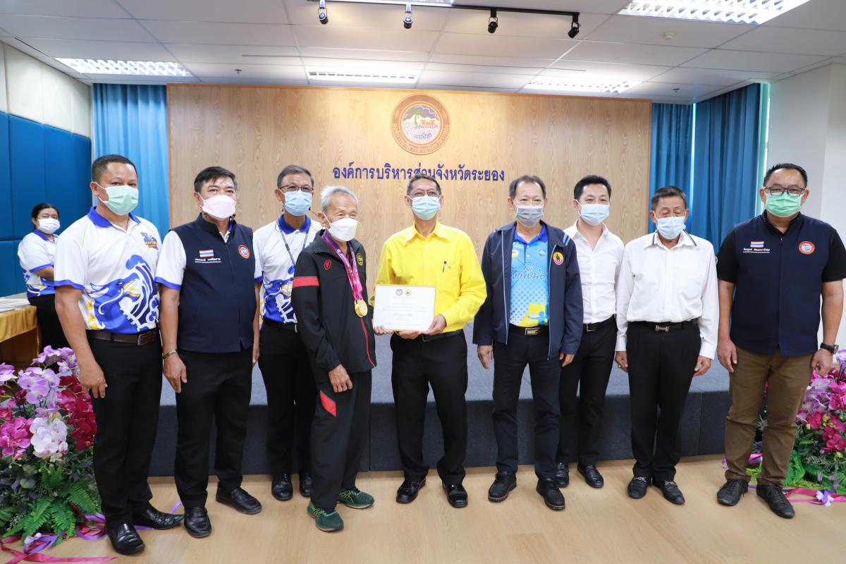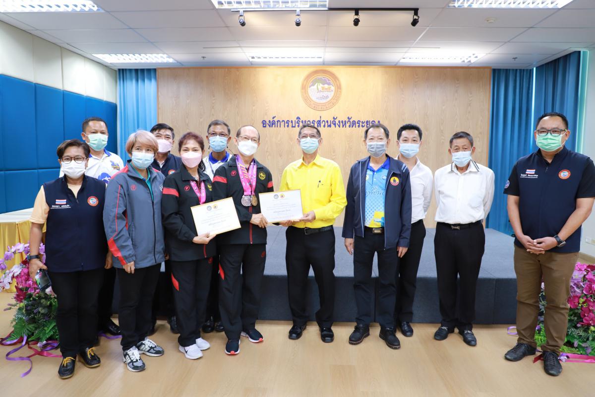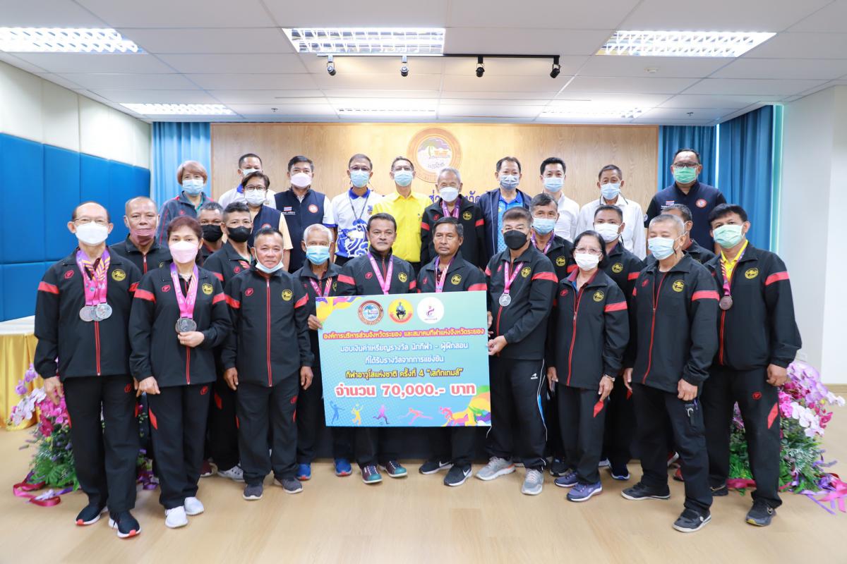 ด้วยสมาคมกีฬาแห่งจังหวัดระยอง ได้เข้าร่วมการแข่งขันกีฬาเยาวชนแห่งชาติ ครั้งที่ 37 "พัทลุงเกมส์" และการแข่งขันกีฬาอาวุโสแห่งชาติ ครั้งที่ 4 "เสกักเกมส์" ณ จังหวัดพัทลุง โดยได้รับการสนับสนุนงบประมาณจากองค์การบริหารส่วนจังหวัดระยอง ให้แก่นักกีฬาและผู้ฝึกสอน และได้ดำเนินการแข่งขันเสร็จสิ้นเป็นที่เรียบร้อยแล้ว ทางองค์การบริหารส่วนจังหวัดระยองจึงได้จัดพิธีมอบเงินค่าเหรียญรางวัลให้แก่นักกีฬาที่สร้างชื่อเสียงให้จังหวัดระยองขึ้น เพื่อเป็นการสร้างขวัญและกำลังใจให้กับคณะนักกีฬาและผู้ฝึกสอน โดยผลหารแข่งขันมีดังนี้ การแข่งขันกีฬาเยาวชนแห่งชาติ ครั้งที่ 37 "พัทลุงเกมส์" จำนวน 8 เหรียญทอง 15 เหรียญเงิน และ 17 เหรียญทองแดง รวม 40 เหรียญ และการแข่งขันกีฬาอาวุโสแห่งชาติ ครั้งที่ 4 "เสกักเกมส์" จำนวน 3 เหรียญทอง 2 เหรียญเงิน และ 8 เหรียญทองแดง รวม 13 เหรียญ