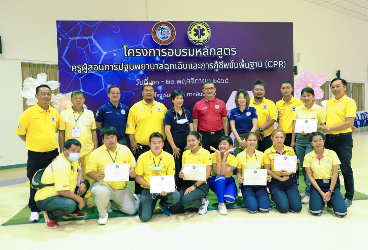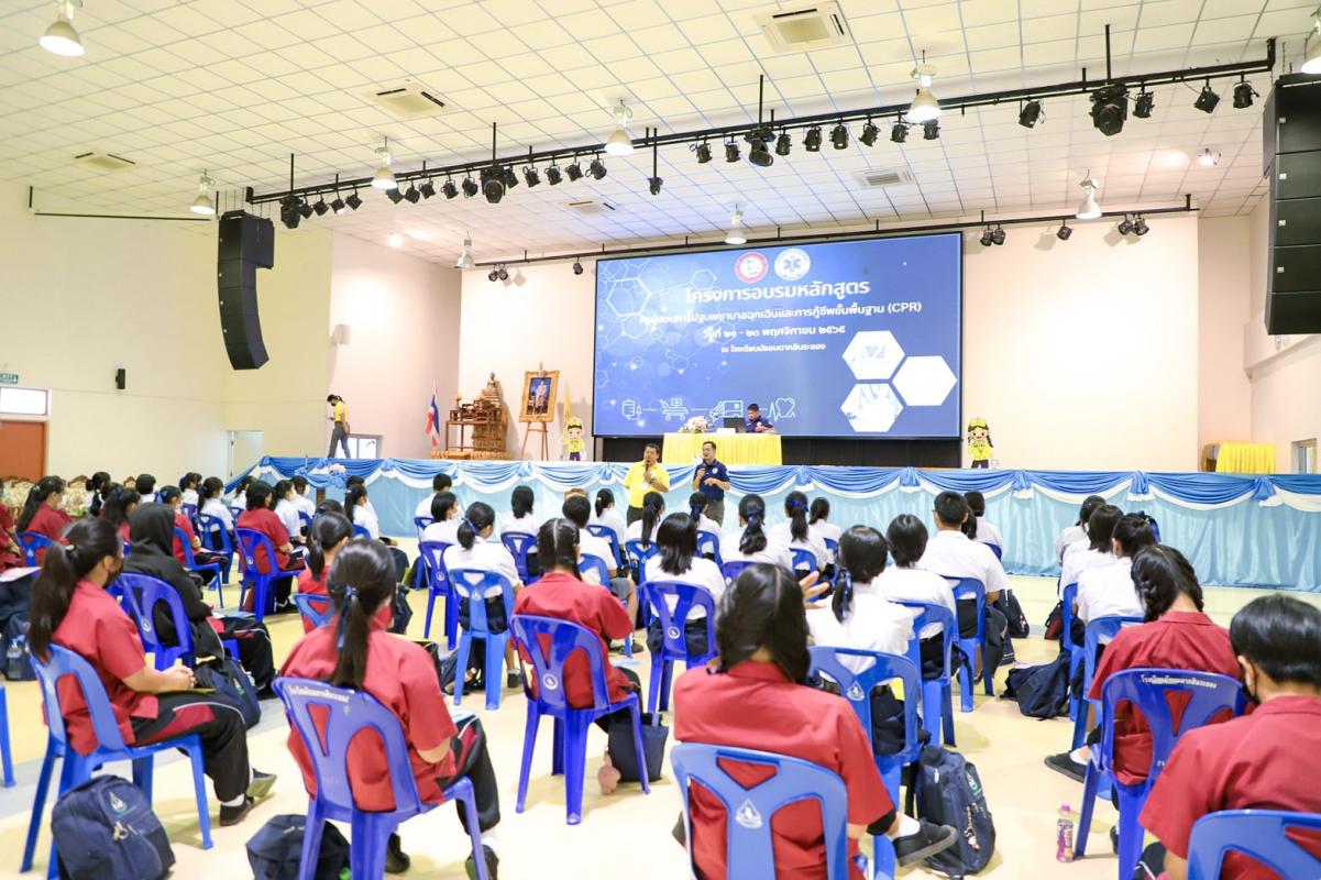วันที่ 23 พฤศจิกายน 2565 การอบรมตามหลักสูตรครูผู้สอนการปฐมพยาบาลฉุกเฉินและการกู้ชีพขั้นพื้นฐาน CPR ณ หอประชุมอาคารเอนกประสงค์ ชั้น 3 โรงเรียนมัธยมตากสิน ซึ่งมีผู้เข้าร่วมโครงการอบรมในครั้งนี้ จำนวน 120 คน และแบ่งการอบรมออกเป็น 2 กลุ่มๆละ 60 คน ซึ่งโครงการอบรมหลักสูตรครูผู้สอนการปฐมพยาบาลฉุกเฉินและการกู้ชีพขั้นพื้นฐาน CPR ภายใต้การดำเนินงานของ อบจ.ระยอง ซึ่งได้ตระหนักและเห็นความสำคัญของการฟื้นคืนชีพในผู้ป่วยหัวใจหยุดเต้นนอกโรงพยาบาล จึงได้จัดอบรมหลักสูตรนี้ขึ้น ในระหว่างวันที่ 21-23 พฤศจิกายน 2565 โดยแบ่งการอบรมออกเป็น 2 กลุ่ม ซึ่งกลุ่มที่ 1เป็นกลุ่มบุคลากรในสังกัด อบจ.ระยอง, บุคลากรในสถานศึกษาที่สังกัด อบจ.ระยอง, เจ้าหน้าที่จากสมาคมและมูลนิธิ/กู้ภัยของ จ.ระยอง และประชาชนผู้ที่สนใจทั่วไป จำนวน 60 คน ซึ่งจะอบรมในระหว่างวันที่ 21-22 พฤศจิกายน 2565 และกลุ่มที่ 2 จะเป็นกลุ่มของนักเรียนในสถานศึกษาสังกัดองค์การบริหารส่วนจังหวัดระยอง จำนวน 60 คน ซึ่งจะเข้ารับการอบรมในวันที่ 23 พฤศจิกายน 2565 ซึ่งผู้เข้ารับการอบรมทุกท่านจะได้รับความรู้และทักษะในการปฐมพยาบาลฉุกเฉิน การกู้ชีพขั้นพื้นฐาน CPR การใช้เครื่องกระตุ้นไฟฟ้าหัวใจอัตโนมัติ AED ในการช่วยเหลือผู้ที่มีภาวะหัวใจหยุดเต้นแบบเฉียบพลัน พร้อมกันนี้จะได้รับความรู้จากระบบการแพทย์ฉุกเฉินและสิทธิผู้ป่วยฉุกเฉินวิกฤต UCEP จากวิทยากรจากสถาบันการแพทย์ฉุกเฉินแห่งชาติ และวิทยากรจากศูนย์การเรียนรู้ชมรมกู้ภัยสว่าง ชลบุรี