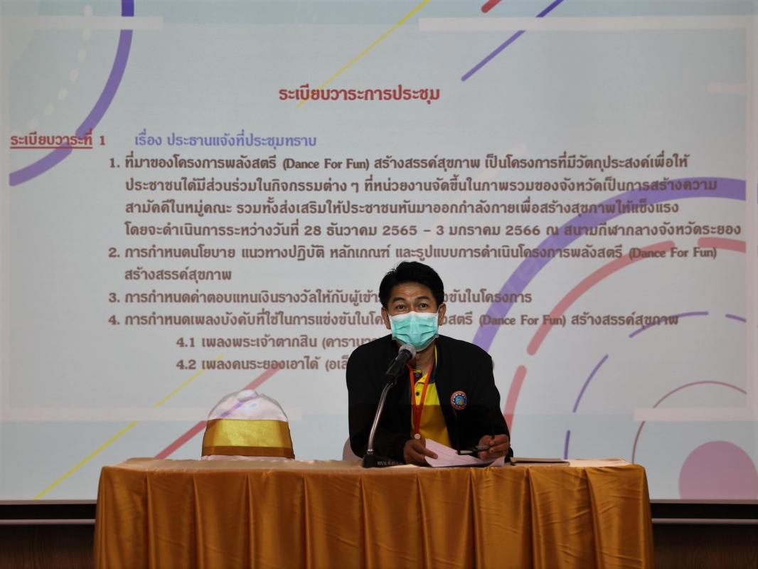 วันที่ 8 ธันวาคม 2565 เวลา 13.30 น. นายสมเกียรติ ยุพาพิน รองปลัดองค์การบริหารส่วนจังหวัดระยอง เป็นประธานเปิดการประชุมคณะทำงาน คณะกรรมการตัดสินและตัวแทนจากทีมที่เข้าร่วมการแข่งขัน โครงการพลังสตรี (Dance For Fun) สร้างสรรค์สุขภาพ พร้อมด้วย นางลัดดาวัลย์ ชาไธสง ผู้อำนวยการกองยุทธศาสตร์และงบประมาณ หัวหน้าส่วนราชการ และผู้ที่เกี่ยวข้องเข้าร่วม ณ ห้องประชุม 3 ชั้น 3 องค์การบริหารส่วนจังหวัดระยอง