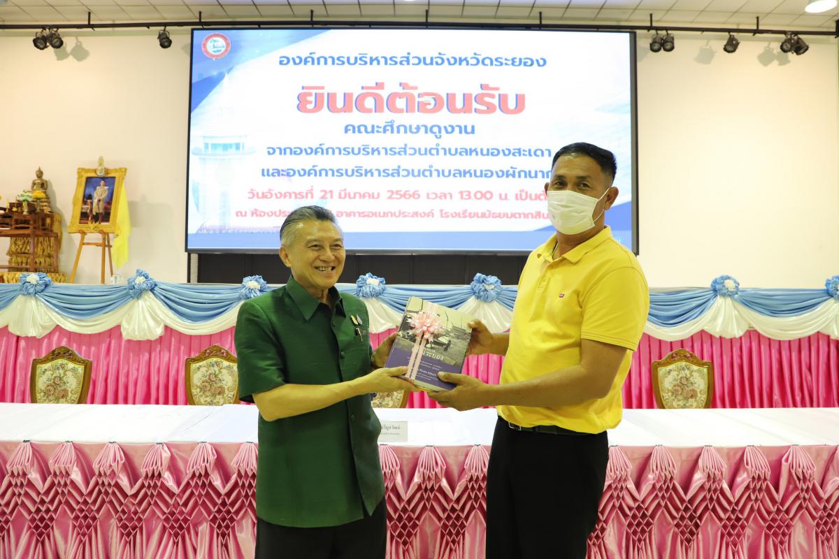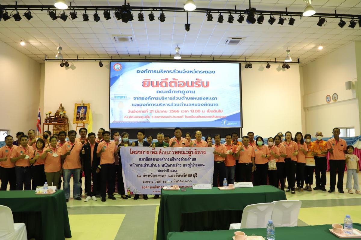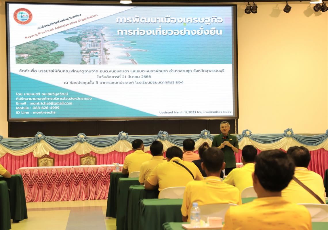 วันที่ 21 มีนาคม 2566 เวลา 13.00 น. นายมนตรี ชนะชัยวิบูลวัฒน์ ที่ปรึกษานายกองค์การบริหารส่วนจังหวัดระยอง พร้อมด้วยนายสมเกียรติ ยุพาพิน รองปลัดองค์การบริหารส่วนจังหวัดระยอง หัวหน้าส่วนราชการ ข้าราชการ และเจ้าหน้าที่อบจ.ระยอง ร่วมให้การต้อนรับคณะศึกษาดูงานจากองค์การบริหารส่วนตำบลหนองสะเดา นำโดยนายจเร ขำสุวรรณ นายกองค์การบริหารส่วนตำบลหนองสะเดา พร้อมคณะจำนวน 44 คน และองค์การบริหารส่วนตำบลหนองผักนาก นำโดยนายอำนาจ เพช็รวงษ์ นายกองค์การบริหารส่วนตำบลหนองผักนาก พร้อมคณะจำนวน 44 คน โดยมาศึกษาดูงานเรื่อง การพัฒนาเมืองเศรษฐกิจ การท่องเที่ยวอย่างยั่งยืน เพื่อเป็นแนวทางในการเพิ่มพูนความรู้และนำมาปรับใช้ในองค์กร ณ หอประชุมชั้น 3 อาคารอเนกประสงค์ โรงเรียนมัธยมตากสินระยอง