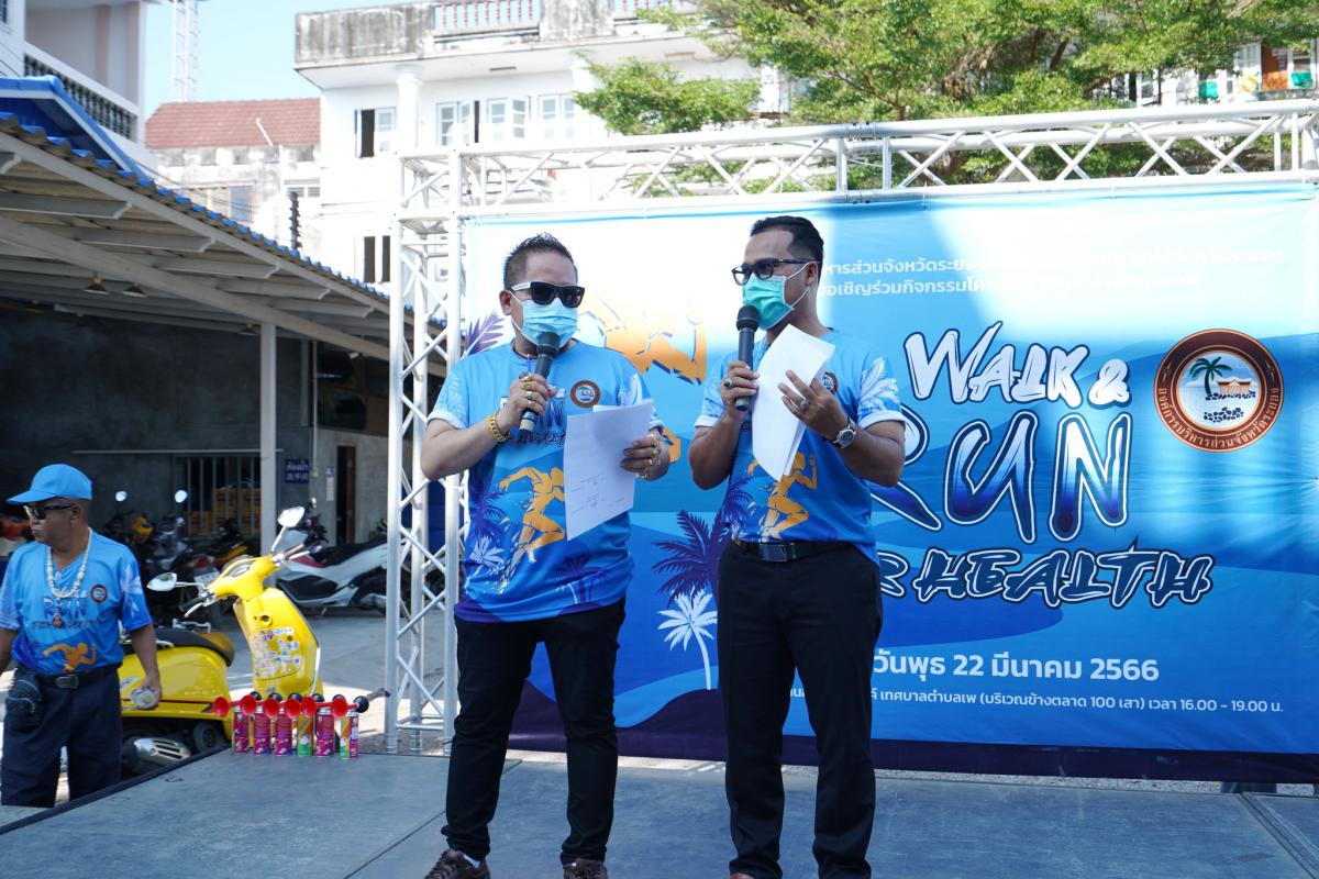 วันที่ 22 มีนาคม 2566 เวลา 17.30 น. ดร.สาธิต ปิตุเตชะ รัฐมนตรีช่วยว่าการกระทรวงสาธารณสุข เป็นประธานในพิธีเปิดกิจกรรม Walk & Run For Health เดิน-วิ่ง เพื่อสุขภาพ โดยมี นายกิตติ เกียรติมนตรี รองนายกองค์การบริหารส่วนจังหวัดระยอง (1) เป็นผู้กล่าวรายงานและวัตถุประสงค์ในการจัดกิจกรรมฯ พร้อมด้วย นายไพรรัตน์ อรุณเวสสะเศรษฐ นายกเทศมนตรีตำบลบ้านเพ กล่าวต้อนรับผู้เข้าร่วมกิจกรรมในครั้งนี้ และ นายสมเกียรติ ยุพาพิน รองปลัดองค์การบริหารส่วนจังหวัดระยอง,นางสาวจิตรลดา ศรีรัตนโช สมาชิกสภาองค์การบริหารส่วนจังหวัดระยอง หัวหน้าส่วนราชการ หน่วยงานภาครัฐและเอกชน ผู้เข้าร่วมกิจกรรม เข้าร่วมกิจกรรมอย่างพร้อมเพรียง ณ ตลาดโบราณบ้านเพ อำเภอเมืองระยอง จังหวัดระยอง
