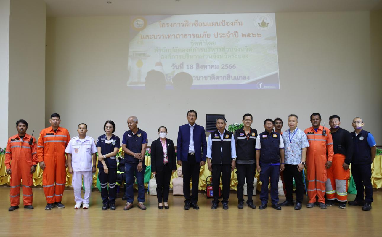 วันที่ 18 สิงหาคม 2566 เวลา 09.00 น. นายจรัญ ความเพียร เลขานุการองค์การบริหารส่วนจังหวัดระยอง ให้เกียรติเป็นประธานในการเปิดโครงการฝึกซ้อมแผนป้องกันและบรรเทาสาธารณภัย ประจำปี 2566 โดยมีนายหิรัญ กล่อมแก้ว หัวหน้าฝ่ายป้องกัน และบรรเทาสาธารณภัย องค์การบริหารส่วนจังหวัดระยอง เป็นผู้กล่าวรายงาน พร้อมด้วยผู้อำนวยการโรงเรียนนานาชาติตากสินแกลง คณะผู้บริหาร หัวหน้าส่วนราชการ คณะครู นักเรียน และเจ้าที่ที่เกี่ยวข้องเข้าร่วมโครงการอย่างพร้อมเพรียง ณ โรงเรียนนานาชาติตากสินแกลง