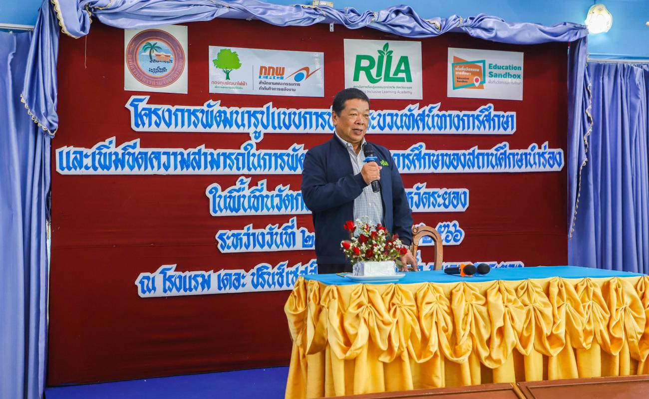 วันที่ 23 สิงหาคม 2566 นายธงชัย มั่นคง ผู้ช่วยผู้อำนวยการสถาบันการเรียนรู้ของคนทุกช่วงวัยจังหวัดระยอง (RILA) ผู้เชี่ยวชาญด้านการศึกษา ศาสนา และวัฒนธรรม เป็นประธานเปิดโครงการพัฒนารูปแบบการปรับกระบวนทัศน์ทางการศึกษาและเพิ่มขีดความสามารถในการพัฒนานวัตกรรมการศึกษาของสถานศึกษานำร่องในพื้นที่นวัตกรรมการศึกษาจังหวัดระยอง รุ่นที่ 4 และได้รับเกียรติจากรองศาสตราจารย์สิทธิชัย วิชัยดิษฐ์ และคณะ มาเป็นวิทยากรบรรยายให้ความรู้พร้อมทำกิจกรรมตลอดการอบรม ซึ่งโครงการฯนี้มีวัตถุประสงค์เพื่อเพิ่มขีดความสามารถในการพัฒนานวัตกรรมการศึกษาของสถานศึกษานำร่องในพื้นที่นวัตกรรมการศึกษาจังหวัดระยอง ณ โรงแรมเดอะปรินซ์เซสส์ บีช ระยอง ตำบลกร่ำ อำเภอแกลง จังหวัดระยอง