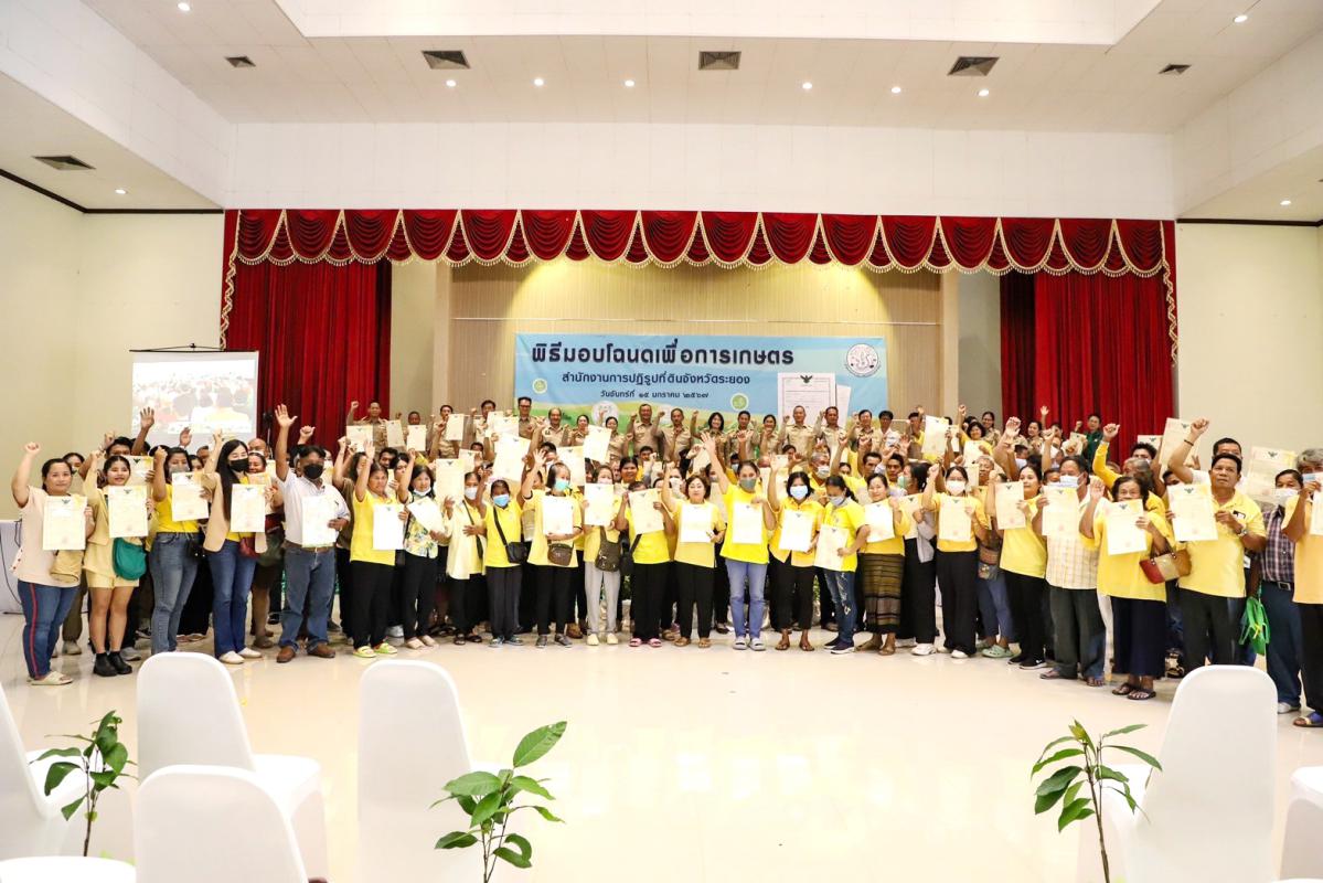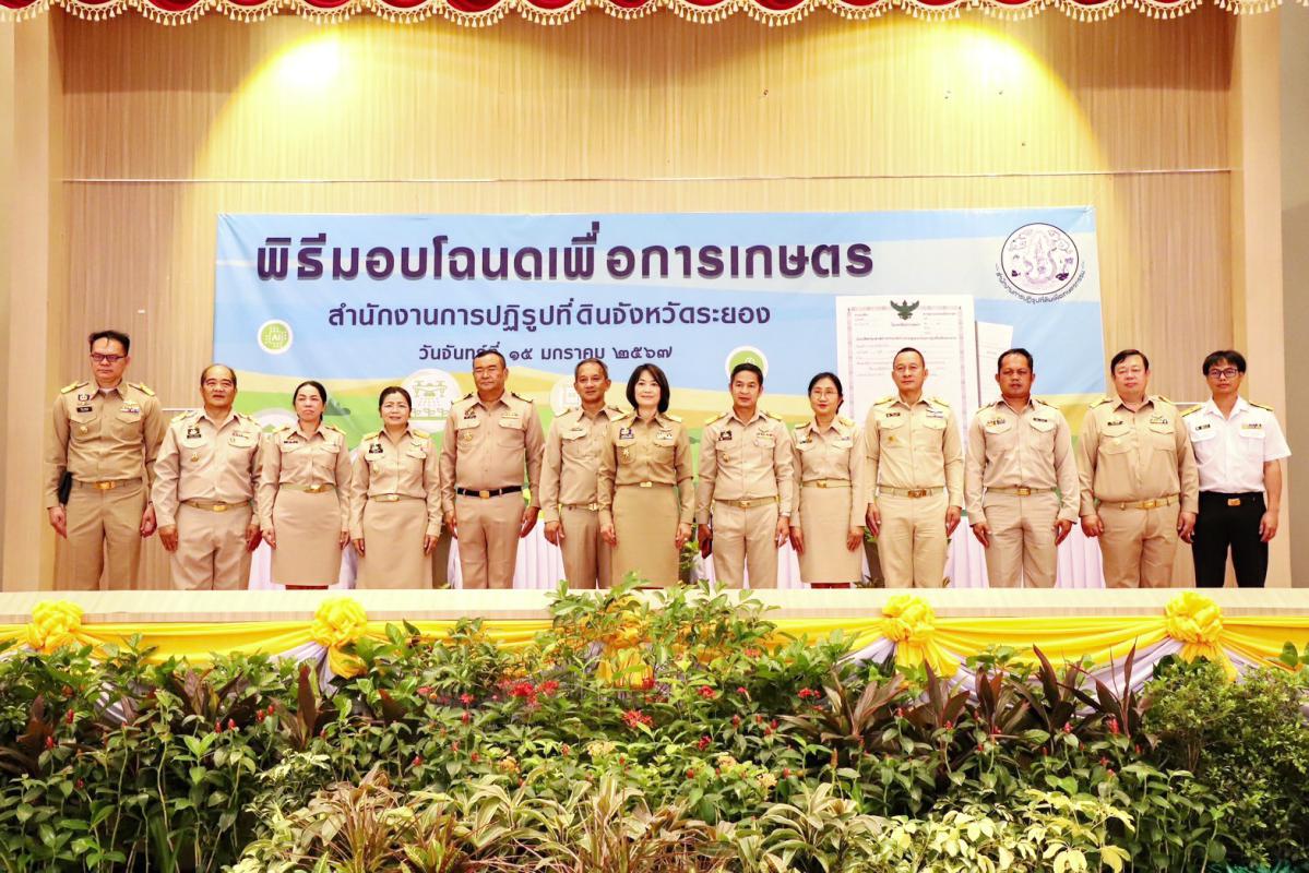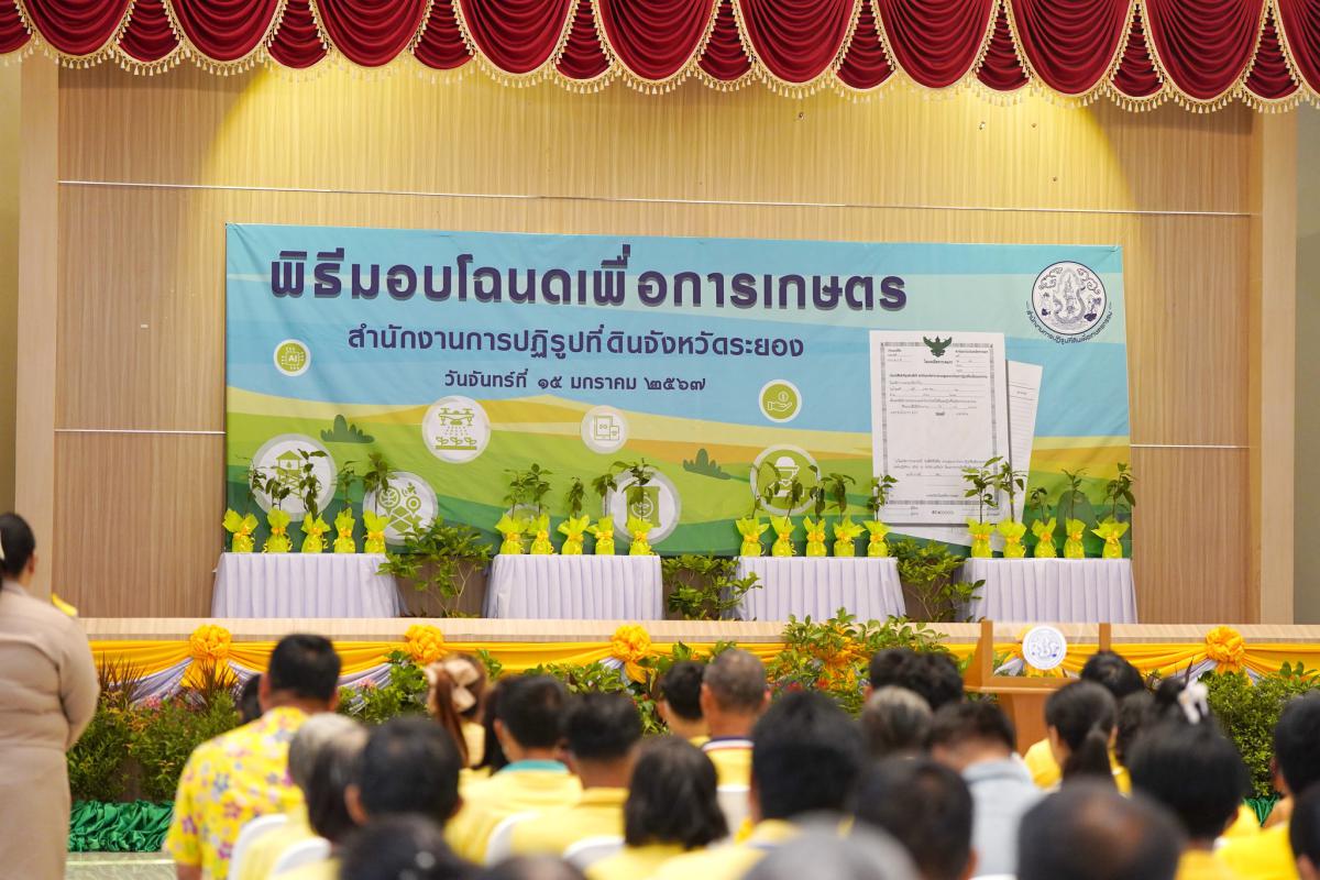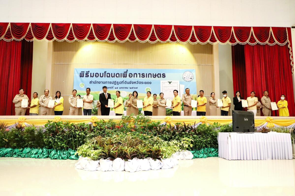 วันที่ 15 มกราคม 2567 เวลา 09.00 น. ณ หอประชุมศาลากลางจังหวัดระยอง นายประสานต์ พฤกษาชาติ รองนายกองค์การบริหารส่วนจังหวัดระยอง (2) พร้อมด้วย หัวหน้าส่วนราชการสังกัดกระทรวงเกษตรและสหกรณ์ในจังหวัดระยอง พี่น้องชาวเกษตรกรอำเภอปลวกแดง อำเภอบ้านค่าย อำเภอเขาชะเมา และอำเภอแกลง และเจ้าหน้าที่ที่เกี่ยวข้องเข้าร่วมพิธีมอบโฉนดเพื่อการเกษตรแก่เกษตรกรในเขตปฏิรูปที่ดิน ของสำนักงานการปฏิรูปที่ดินเพื่อเกษตรกรรม (ส.ป.ก.) โดยมีนางสาวสลารีวรรณ ทัพทวี รองผู้ว่าราชการจังหวัดระยอง เป็นประธานในพิธี ซึ่งพิธีการมอบโฉนดที่ดินในครั้งนี้มีวัตถุประสงค์ เพื่อให้เกษตรกรสามารถนำไปต่อยอดในการเข้าถึงโอกาส การให้บริการของภาครัฐ โอกาสการเข้าถึงแหล่งเงินทุนได้เพิ่มมากขึ้น และให้เกษตรกรได้มีทางเลือกในการพัฒนาที่ดิน และพัฒนาอาชีพของตนเอง เพื่อสร้างคุณภาพชีวิตที่ดีขึ้นอย่างยั่งยืนต่อไป