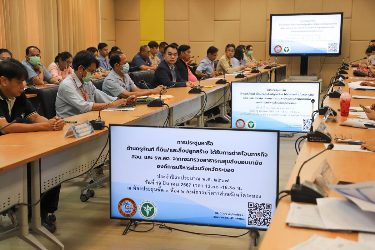 วันที่ 19 มีนาคม 2567 เวลา 13.00 น. นายสุรินทร์ แสงทอง ปลัดองค์การบริหารส่วนจังหวัดระยอง พร้อมด้วยนายสมเกียรติ ยุพาพิน รองปลัดฯ, นายสมบัติ มุมทอง หัวหน้าสำนักปลัดฯ, นายสุริยะ ศิริวัฒน์ รก.ผอ.กองสาธารณสุข, นางสาวกวินนาถ วงษ์วารี เจ้าหน้าที่จัดผลประโยชน์ชำนาญการพิเศษ ธนารักษ์พื้นที่ระยอง, นายชูศักดิ์ อุดมพืชน์ นายช่างเทคนิคชำนาญงาน สาธารณสุขจังหวัดระยอง, เจ้าหน้าที่กองช่าง อบจ.ระยอง, ผู้อำนวยการ รพ.สต.และเจ้าหน้าที่ที่เกี่ยวข้องร่วม “ประชุมหารือด้านพัสดุครุภัณฑ์ ที่ดิน และสิ่งปลูกสร้าง ที่ได้รับการถ่ายโอนภารกิจ สอน. และ รพ.สต. จากกระทรวงสาธารณสุขมายังองค์การบริหารส่วนจังหวัดระยอง” ณ ห้องประชุม 2 ชั้น 3 อบจ.ระยอง ซึ่งในที่ประชุมได้แจ้งถึงบันทึกการส่งมอบการถ่ายโอนภารกิจสถานีอนามัยเฉลิมพระเกียรติ 60 พรรษา นวมินทราชินีและโรงพยาบาลส่งเสริมสุขภาพตำบลให้แก่องค์การบริหารส่วนจังหวัดระยอง ปีงบประมาณ 2567 จำนวน 45 แห่ง และได้แจ้งถึงปัญหาอุปสรรคในการถ่ายโอน ในปีงบประมาณ 2566 ที่ผ่านมา มีรพ.สต. จำนวน 40 แห่ง ที่พบปัญหาเกี่ยวกับที่ดินและสิ่งก่อสร้าง ส่วนในปีงบประมาณ 2567 รพ.สต.จำนวน 45 แห่ง พบปัญหาเกี่ยวกับพัสดุครุภัณฑ์ ที่ดินและสิ่งก่อสร้าง ซึ่งได้ร่วมกันหารือแนวทางในการแก้ไขปัญหาดังกล่าวต่อไป
