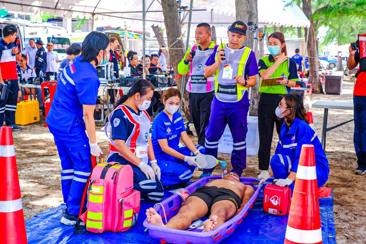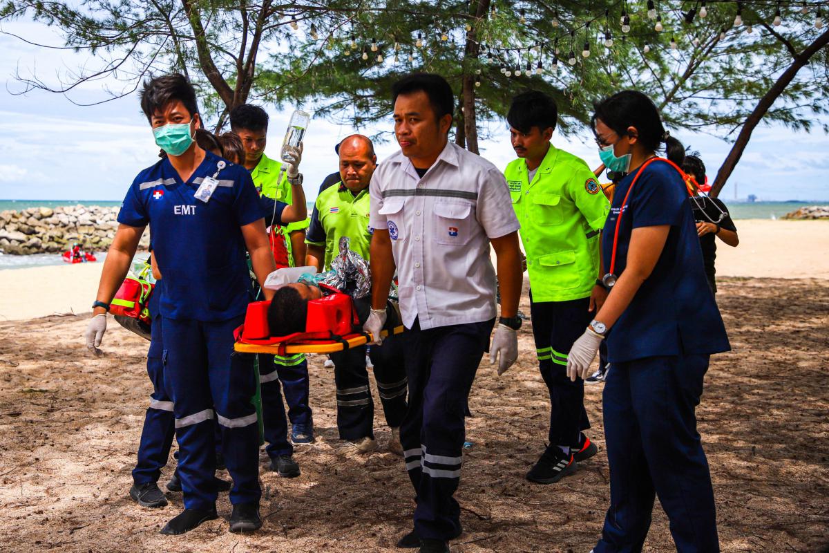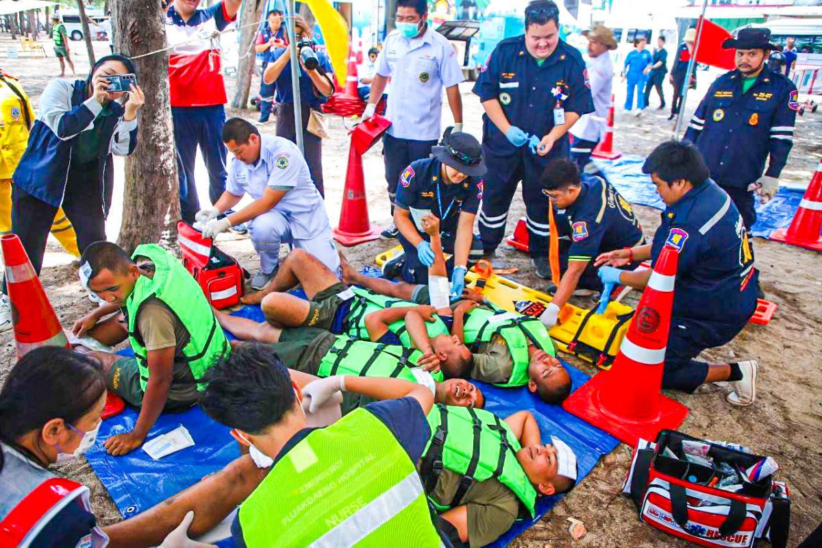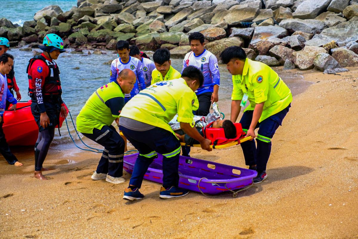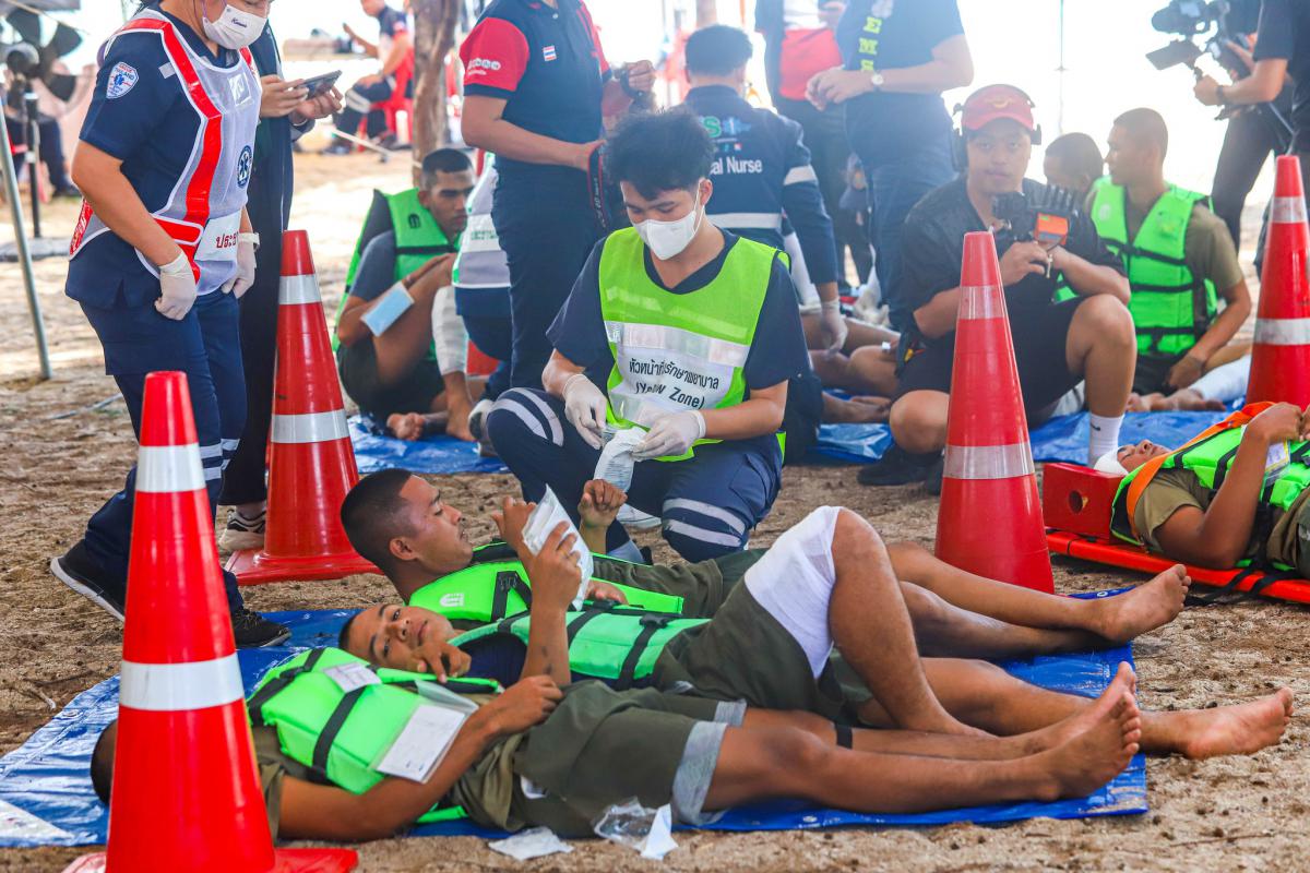 ภาพบรรยากาศการฝึกซ้อมแผนกู้ชีพและลำเลียงผู้ป่วยทางทะเลในสถานกาณ์เสมือนจริง ณ ชายหาดแหลมเจริญ ตำบลปากน้ำ อำเภอเมืองระยอง