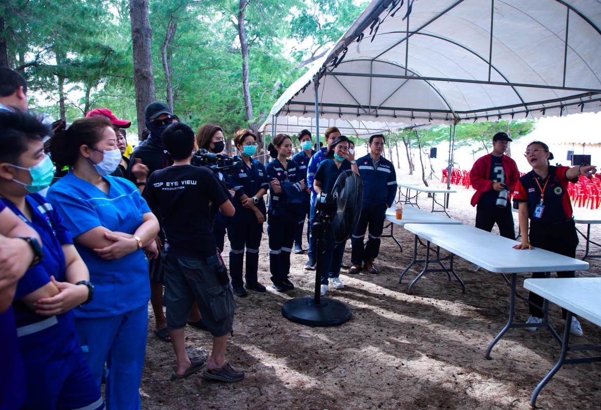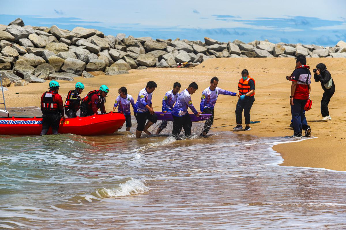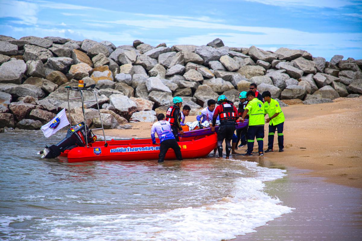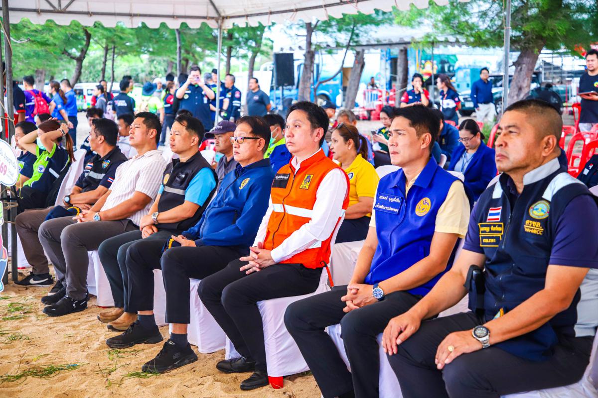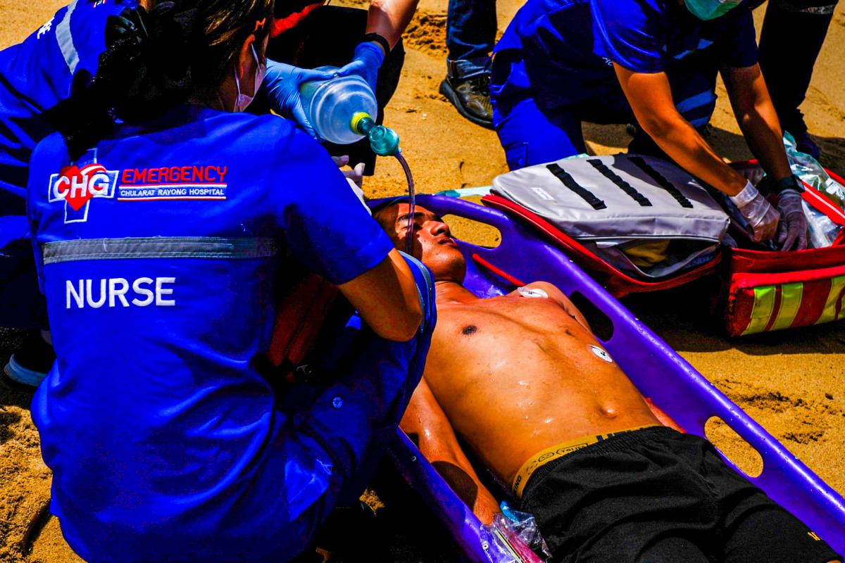 ภาพบรรยากาศการฝึกซ้อมแผนกู้ชีพและลำเลียงผู้ป่วยทางทะเลในสถานกาณ์เสมือนจริง ณ ชายหาดแหลมเจริญ ตำบลปากน้ำ อำเภอเมืองระยอง