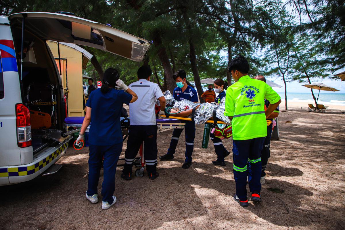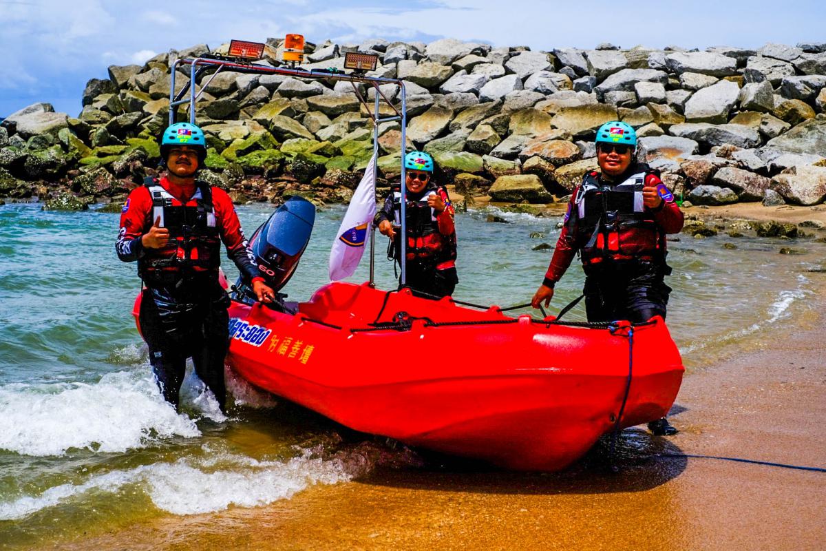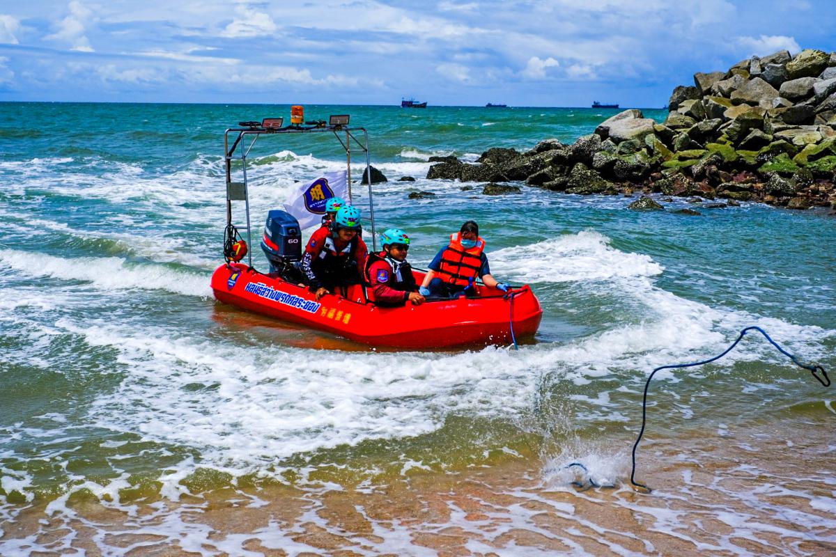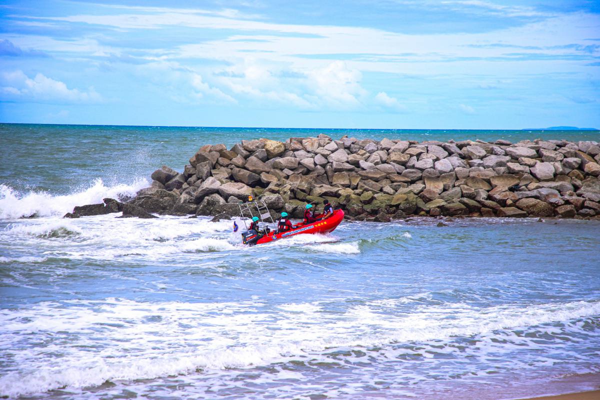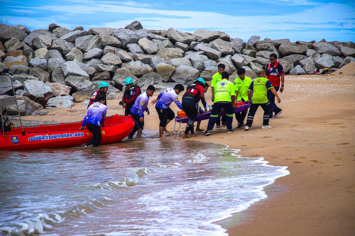 ภาพบรรยากาศการฝึกซ้อมแผนกู้ชีพและลำเลียงผู้ป่วยทางทะเลในสถานกาณ์เสมือนจริง ณ ชายหาดแหลมเจริญ ตำบลปากน้ำ อำเภอเมืองระยอง
