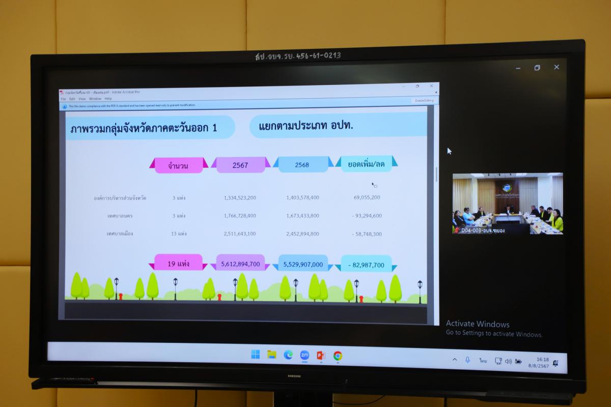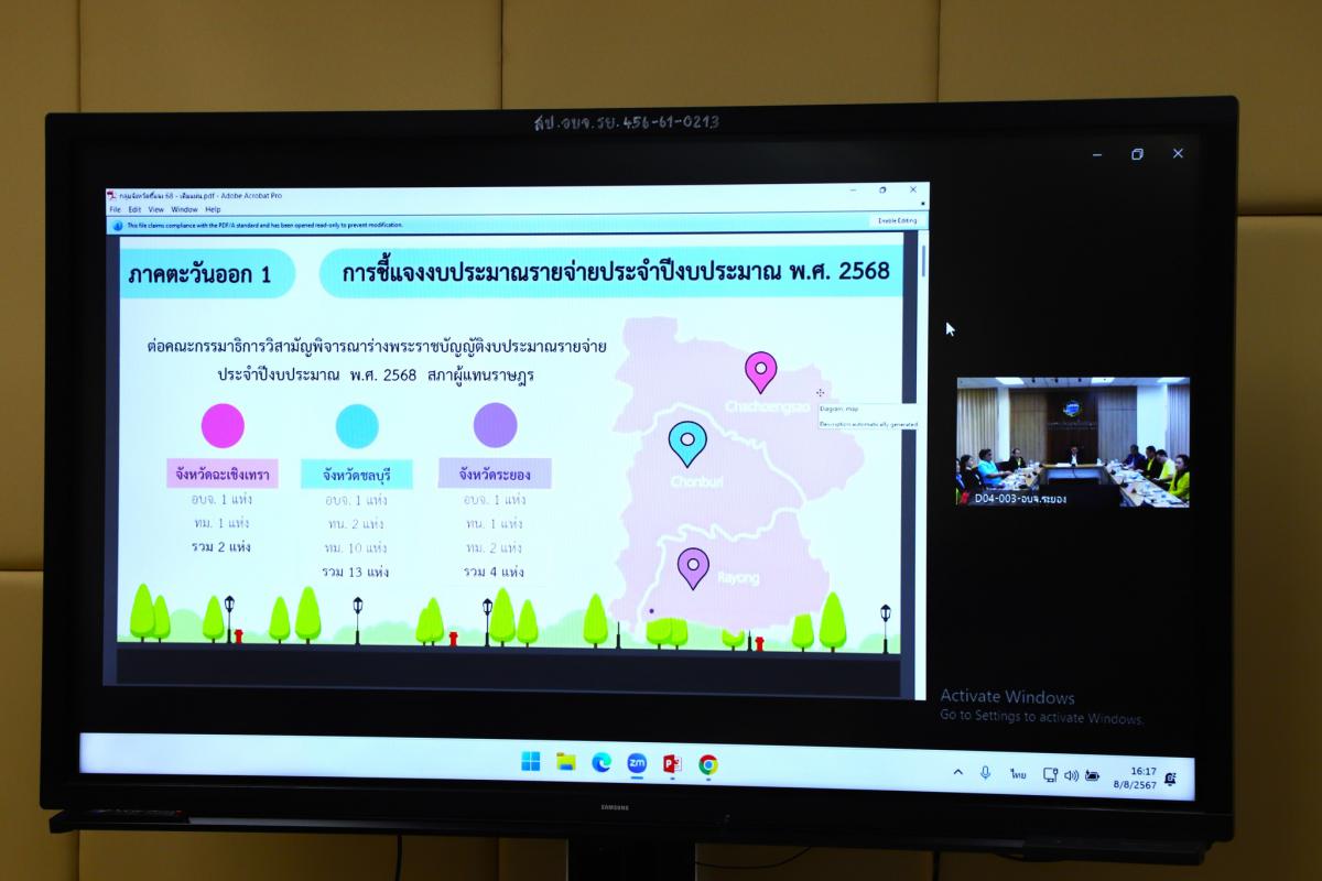 วันที่ 8 สิงหาคม 2567 เวลา 16.00 น. นายปิยะ ปิตุเตชะ นายกองค์การบริหารส่วนจังหวัดระยอง พร้อมด้วย นาย ถวิล โพธิบัวทอง นายกเทศมนตรีเมืองมาบตาพุด, นายนรินทร์ เจนจิรวัฒนา รองนายกเทศมนตรีนครระยอง, นางสาวชิดชนก ภาณุพัต รองนายกเทศมนตรีเมืองบ้านฉาง หัวหน้าส่วนราชการ และเจ้าหน้าที่ที่เกี่ยวข้อง เข้าร่วมประชุมชี้แจงกับคณะกรรมาธิการวิสามัญพิจารณาร่างพระราชบัญญัติงบประมาณรายจ่ายประจำปีงบประมาณ พ.ศ. 2568 ผ่านสื่ออิเล็กทรอนิกส์ ( Video Conference ) โดยองค์การบริหารส่วนจังหวัดระยองได้รับงบประมาณเพื่อมาพัฒนาจังหวัดระยองรวมทั้งสิ้น 450,942,900 บาท ณ ห้องประชุม 2 ชั้น 3 องค์การบริหารส่วนจังหวัดระยอง