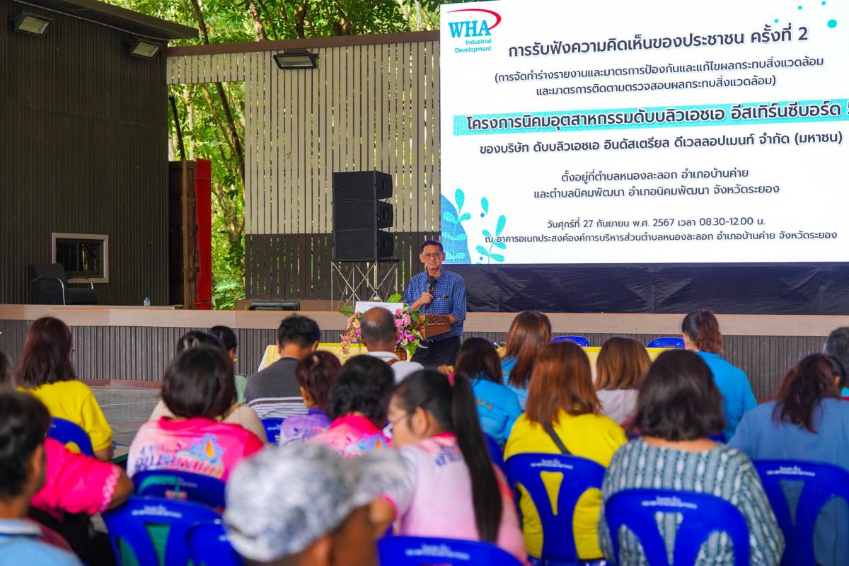 โดยได้รับเกียรติจากนายสุนทร คงสุนทรกิจกุล ที่ปรึกษาบริษัทดับบลิวเอชเอ อินดัสเตรียล ดีเวลลอปเมนท์ จำกัด (มหาชน) เป็นผู้กล่าวรายงานถึงวัตถุประสงค์ของการจัดทำโครงการดังกล่าว และได้รับเกียรติจากนายกฤษฎาธร ทรัพย์อุไรรัตน์ ผู้ชำนาญการสิ่งแวดล้อม มาเป็นวิทยากรในการบรรยายตามวัตถุประสงค์ที่จัดโครงการในครั้งนี้ กล่าวคือเพื่อนำเสนอผลการศึกษาผลกระทบสิ่งแวดล้อม และมาตรการติดตามตรวจสอบผลกระทบสิ่งแวดล้อมของโครงการ และเปิดโอกาสให้ผู้เช้าร่วมรับฟังความคิดเห็นได้แสดงความคิดเห็น ข้อห่วงกังวล และให้ข้อเสนอแนะต่อผลการศึกษา และมาตรการด้านสิ่งแวดล้อมดังกล่าว เพื่อให้โครงการได้นำไปปรับปรุงรายงานให้มีความสมบูรณ์และลดผลกระทบต่อประชาชนต่อไปในระยะยาว