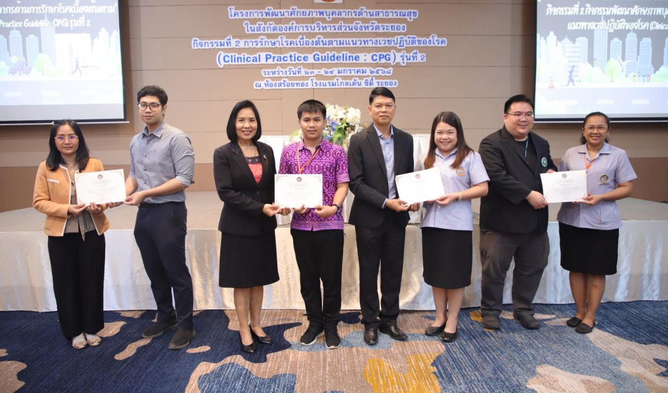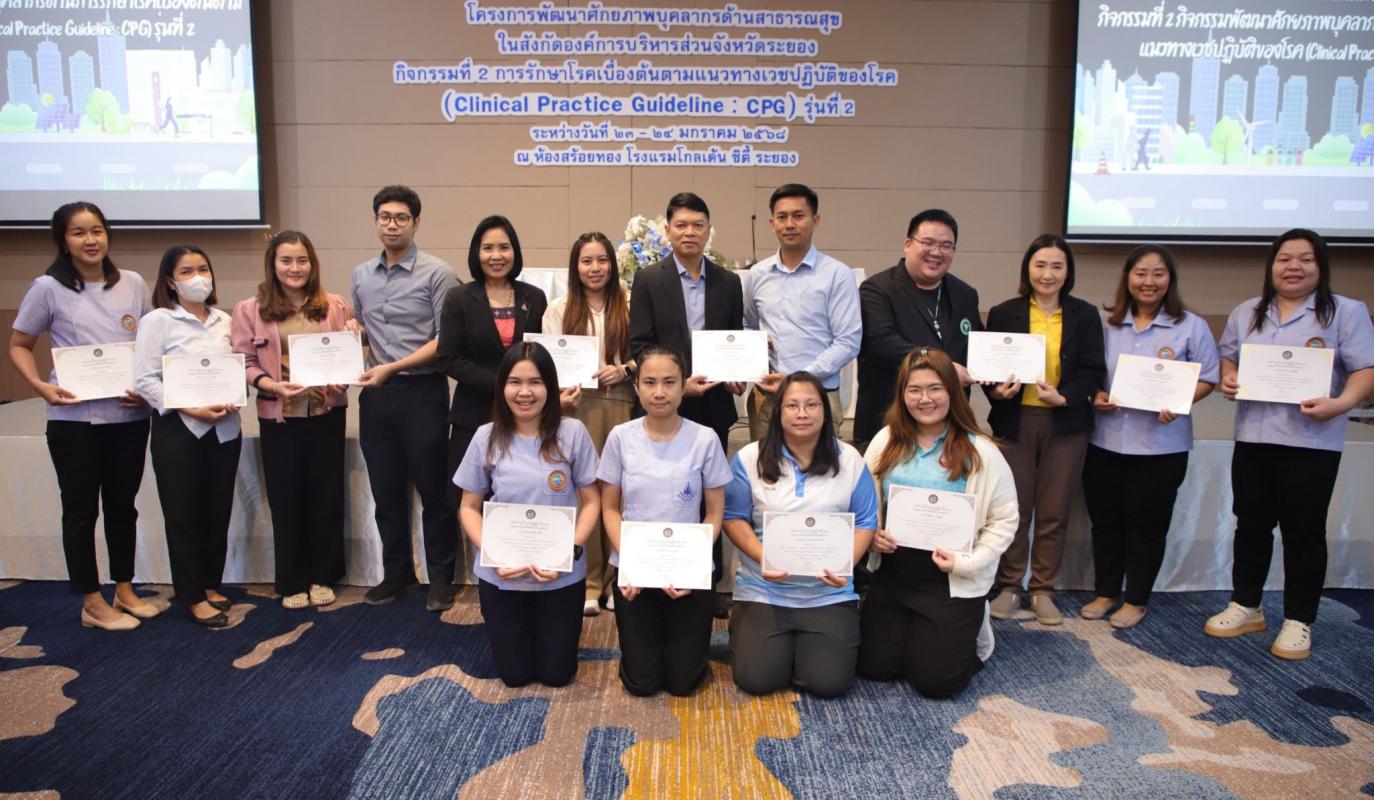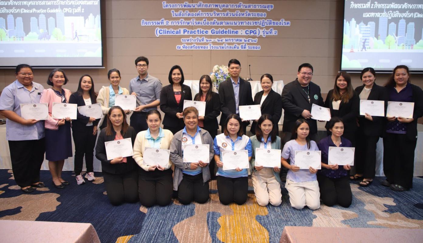 วันที่ 24 มกราคม 2568 นายเสรี เพ็งสาท รองปลัดองค์การบริหารส่วนจังหวัดระยอง ให้เกียรติมอบเกียรติบัตรให้แก่ผู้ผ่านการอบรม "โครงการพัฒนาศักยภาพบุคลากรด้านสาธารณสุข ในสังกัดองค์การบริหารส่วนจังหวัดระยอง กิจกรรมพัฒนาศักยภาพบุคลากรด้านการรักษาโรคเบื้องต้นตามแนวทางเวชปฏิบัติของโรค" รุ่นที่ 2 (Clincal Practice Guideline : CPG) ณ โรงแรมโกลเด้น ซิตี้ ระยอง