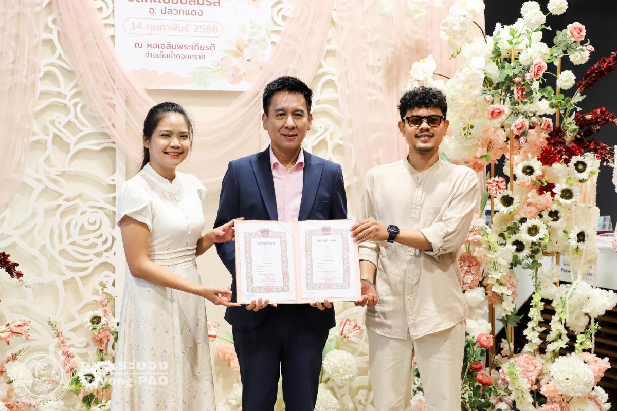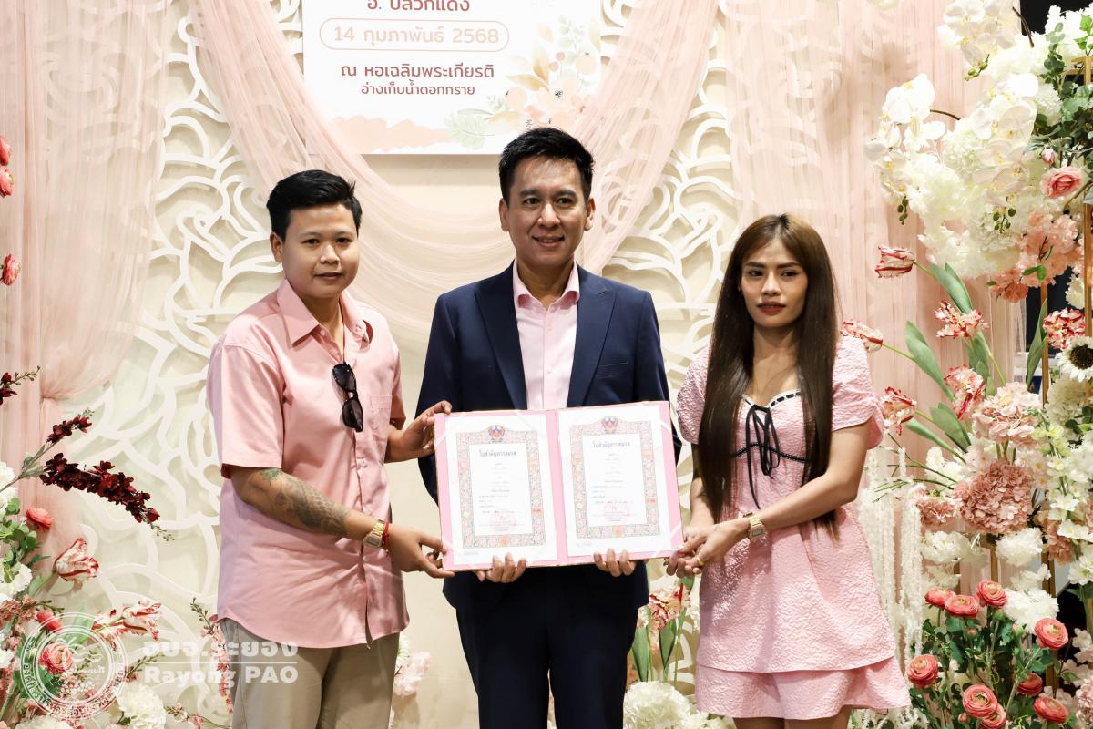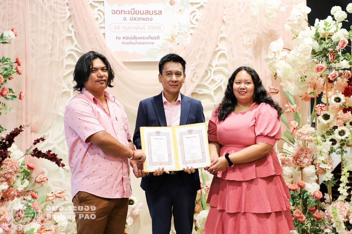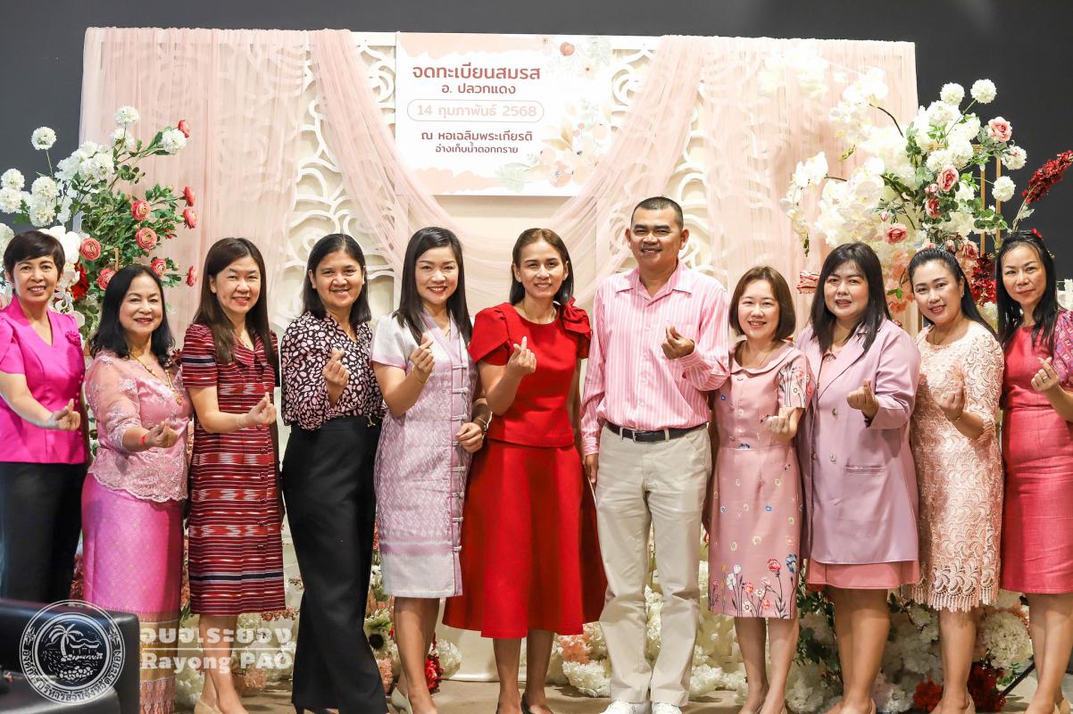วันที่ 14 กุมภาพันธ์ 2568 นางสาวสุธัญญา สุขรมย์ รองปลัดองค์การบริหารส่วนจังหวัดระยอง พร้อมด้วย คณะผู้บริหาร หัวหน้าส่วนราชการ และผู้ที่เกี่ยวข้องเข้าร่วมโครงการจดทะเบียนสมรสเนื่องในวันแห่งความรัก (Valentine’s Day 2025) โดยมีนายสกนธ์ กรกฎ นายอำเภอปลวกแดง เป็นประธานเปิดงานให้กับคู่บ่าว-สาว ที่ได้ลงทะเบียนไว้ ซึ่งมีนางกฤษณา ช้างหัวหน้า ปลัดอำเภอหัวหน้ากลุ่มงานทะเบียนและบัตรอำเภอปลวกแดงเป็นผู้กล่าวรายงาน ภายในงานมีกิจกรรมการจดทะเบียนสมรส, การถ่ายภาพพร้อมมอบของที่ระลึก และมอบของรางวัลพิเศษแก่ผู้ที่มาจดทะเบียนเพื่อความเป็นสิริมงคล ซึ่งภายในงานมีคู่มาจดทะเบียนสมรส 14 คู่ ณ หอเฉลิมพระเกียรติ อ่างเก็บน้ำดอกกราย อำเภอปลวกแดง จังหวัดระยอง