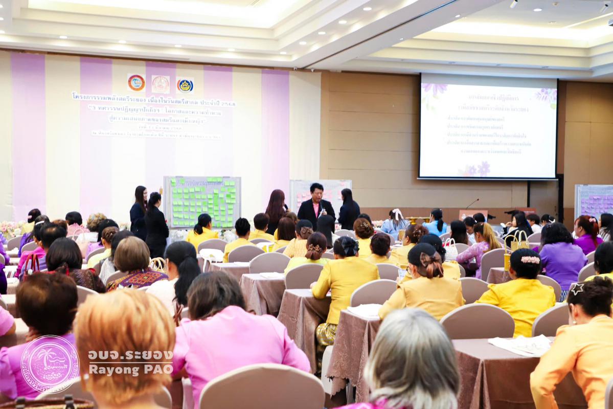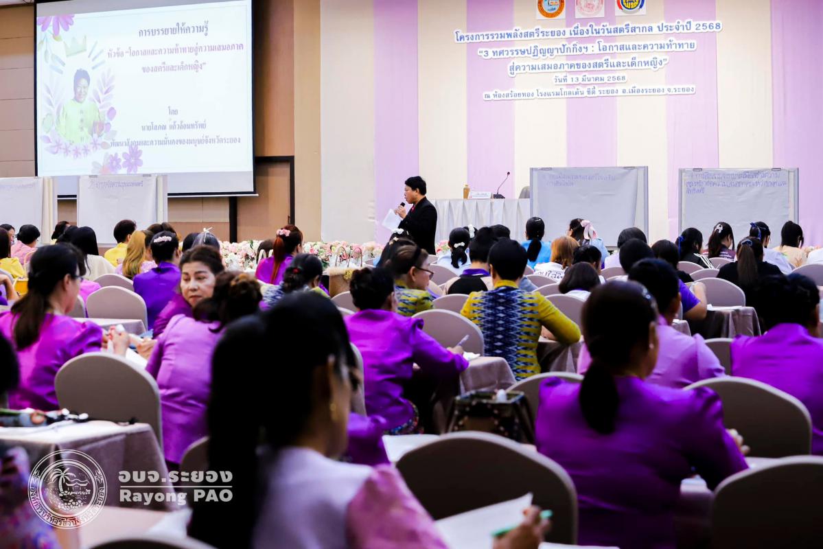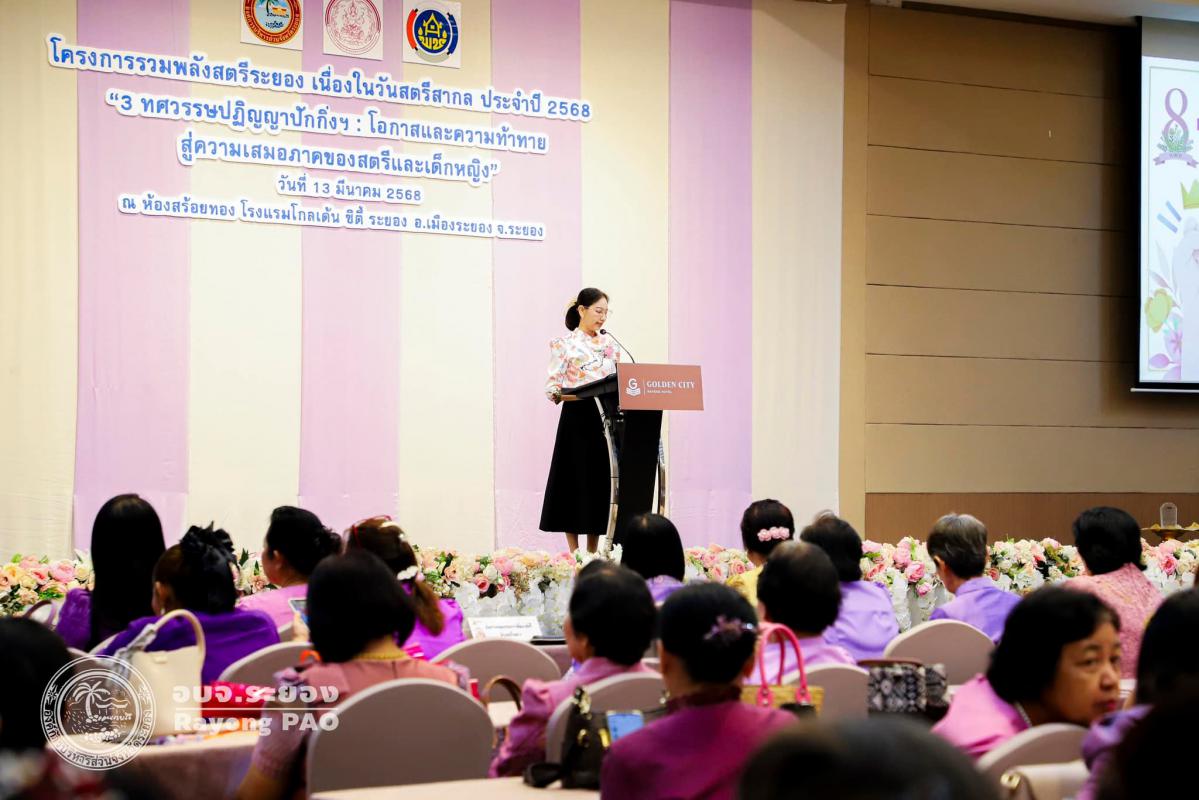 วันที่ 13 มีนาคม 2568 เวลา 08.30 น. องค์การบริหารส่วนจังหวัดระยอง ร่วมกับหน่วยงานที่เกี่ยวข้อง จัดโครงการรวมพลังสตรีระยอง เนื่องในวันสตรีสากลประจำปี 2568 “3 ทศวรรษปฏิญญาปักกิ่งฯ : โอกาสและความท้าทายสู่ความเสมอภาคของสตรีและเด็กหญิง” เพื่อเป็นการกระตุ้นให้ทุกภาคส่วนในสังคมตระหนักถึงความสำคัญของวันสตรีสากลสนับสนุนและร่วมกับภาคีเครือข่ายจัดกิจกรรมที่เป็นประโยชน์ต่อสตรี ชุมชนและสังคม การพัฒนาวิสัยทัศน์ของสตรีให้เป็นผู้มีความมั่นใจและกล้าแสดงออก ซึ่งกิจกรรมภายในงานมีกิจกรรมมอบโล่เชิดชูเกียรติสตรีดีเด่นจังหวัดระยอง จำนวน 5 รางวัล กิจกรรมการแสดง ชุด รำวงคนระยอง ทีมชมรมรักสุขภาพตำบลน้ำคอก การอบรมให้ความรู้ในหัวข้อ "โอกาสและความท้าทายสู่ความเสมอภาคของสตรีและเด็กหญิง" โดย นายโสภณ แก้วล้อมทรัพย์ พัฒนาสังคมและความมั่นคงของมนุษย์จังหวัดระยอง และการสัมมนาเชิงปฏิบัติการ เวทีสมัชชาสตรีระดับจังหวัดระยอง โดยมีนางสาวสลารีวรรณ ทัพทวี รองผู้ว่าราชการจังหวัดระยอง เป็นประธานในพิธีเปิดโครงการฯ และนายสุรินทร์ แสงทอง ปลัดองค์การบริหารส่วนจังหวัดระยอง เป็นผู้กล่าววัตถุประสงค์ของการจัดโครงการฯ พร้อมด้วยคณะผู้บริหาร หัวหน้าส่วนราชการ กลุ่มองค์กรสตรี ผู้นำสตรีในชุมชน ประชาชนทั่วไปในพื้นที่ในจังหวัดระยอง และหน่วยงานที่เกี่ยวข้อง เข้าร่วมโครงการฯโดยพร้อมเพรียงกัน ณ ห้องสร้อยทอง โรงแรมโกลเด้น ซิตี้ ระยอง