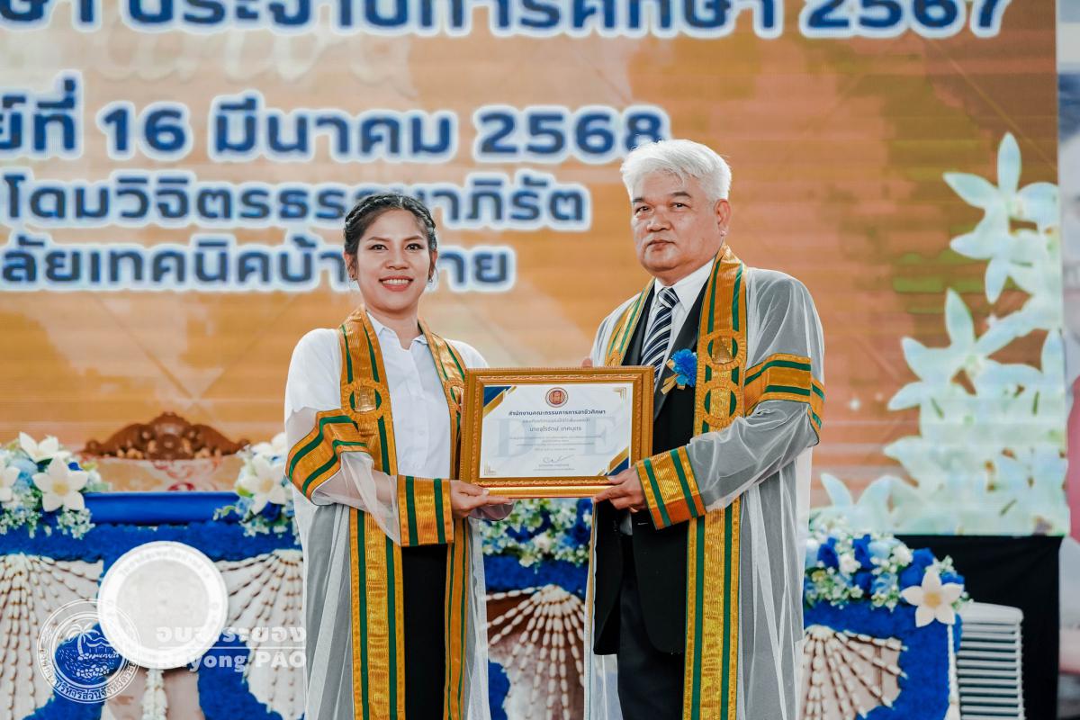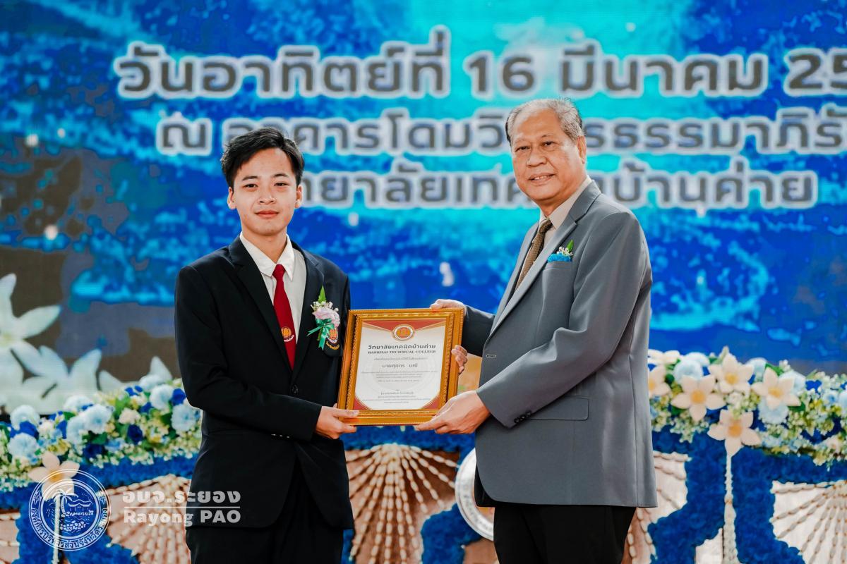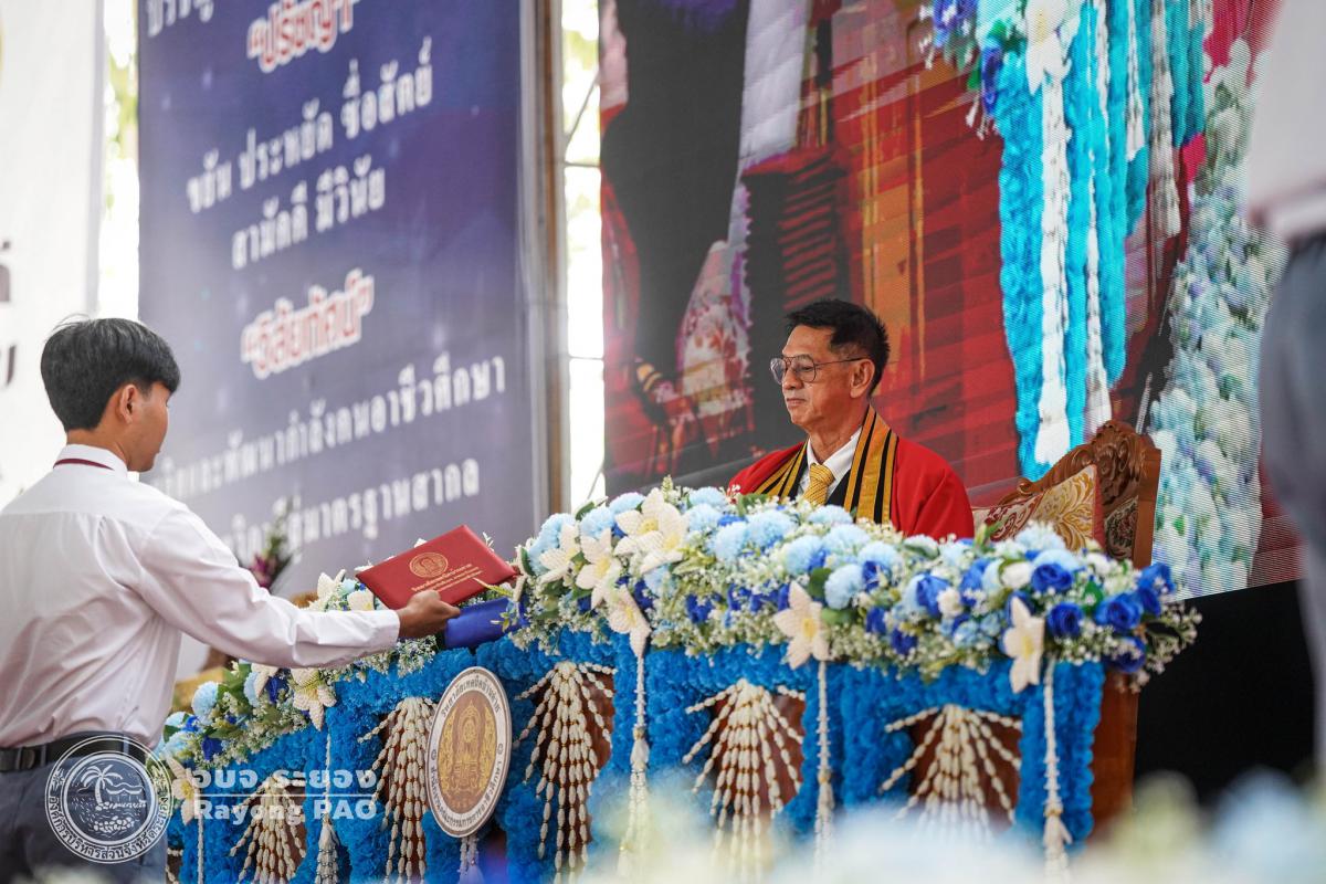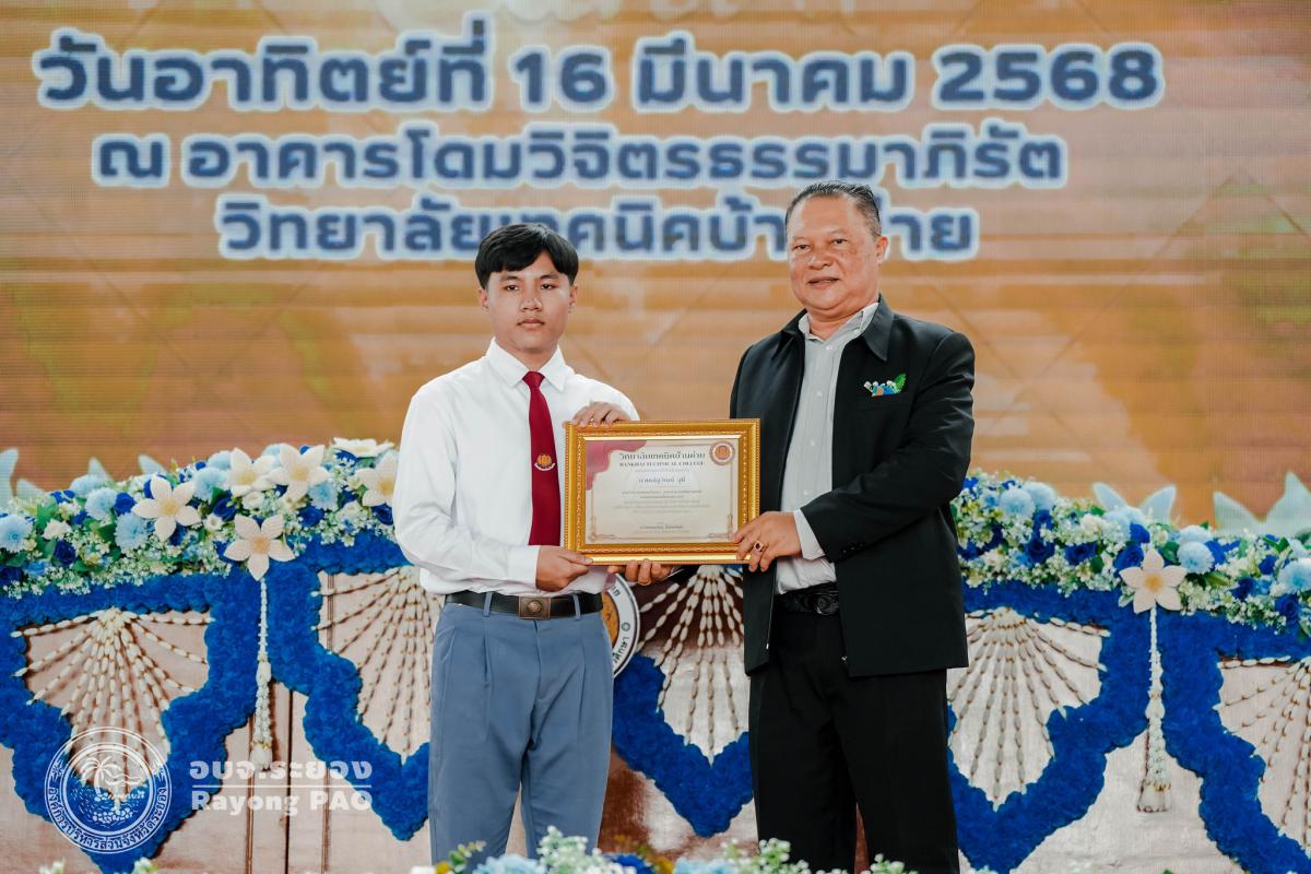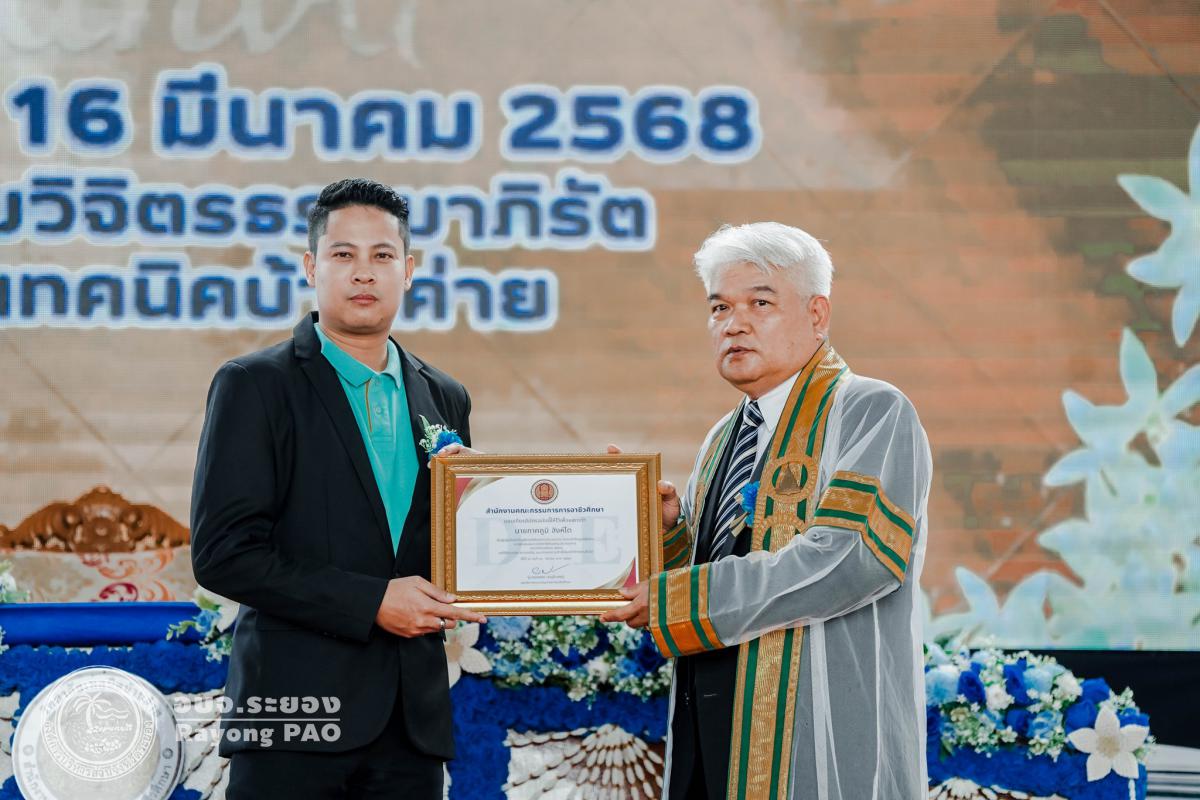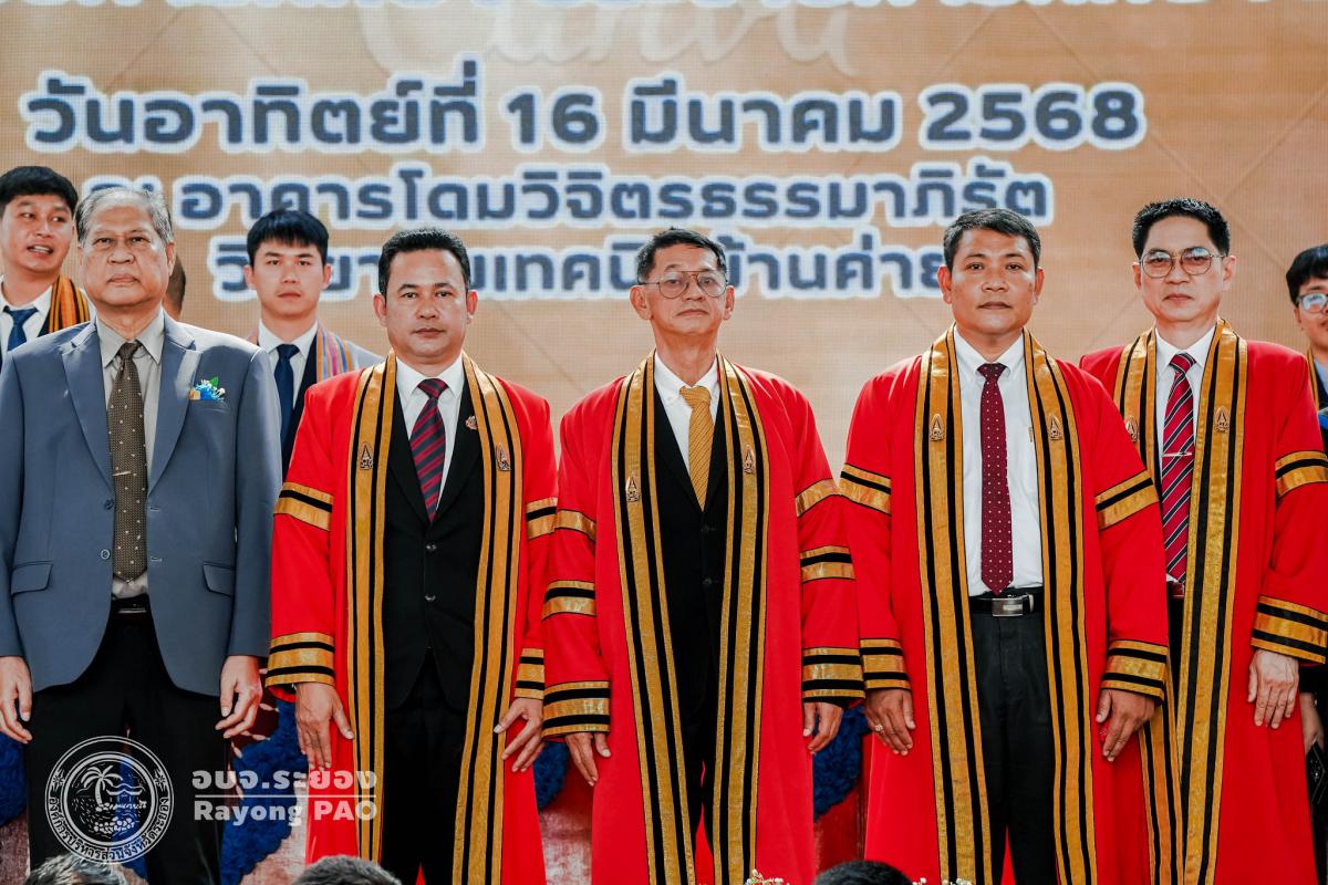 วันที่ 16 มีนาคม 2568 เวลา 08.00 น. นายปิยะ ปิตุเตชะ นายกองค์การบริหารส่วนจังหวัดระยอง เป็นประธานในพิธีมอบประกาศนียบัตรให้แก่ผู้สำเร็จการศึกษา ประจำปี 2568 ระดับประกาศนียบัตรวิชาชีพ (ปวช.) และระดับประกาศนียบัตรวิชาชีพชั้นสูง (ปวส.) โดยมี นายยุทธพันธ์ โคตรพันธ์ ผู้อำนวยการวิทยาลัยเทคนิคบ้านค่าย เป็นผู้กล่าวรายงาน พร้อมด้วย คณะครู นักศึกษา และผู้ที่เกี่ยวข้องเข้าร่วมพิธีมอบประกาศนียบัตรฯ โดยพร้อมเพรียงกัน ซึ่งภายในงานได้มีการมอบประกาศนียบัตรให้แก่สำเร็จการศึกษาในระดับประกาศนียบัตรวิชาชีพ (ปวช.) และระดับประกาศนียบัตรวิชาชีพชั้นสูง (ปวส.) จำนวน 879 คน เพื่อเป็นการแสดงความยินดีแก่ผู้ที่สำเร็จการศึกษา ประจำปี 2568 ณ อาคารโดมวิจิตรธรรมาภิรัต วิทยาลัยเทคนิคบ้านค่าย