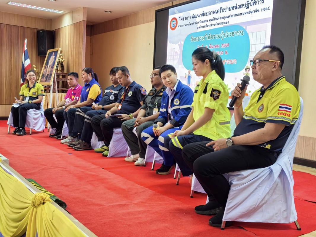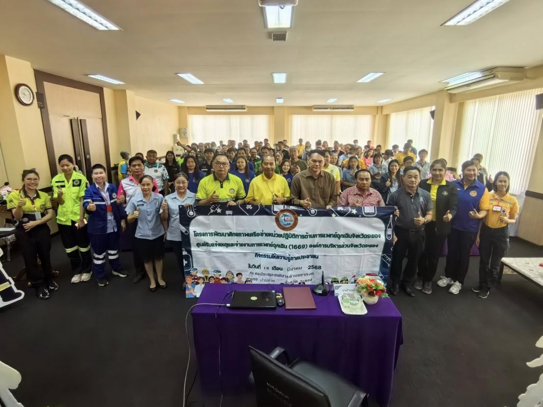 วันที่ 18 มีนาคม 2568 เวลา 09.00 น. กองสาธารณสุข จัดโครงการพัฒนาศักยภาพเครือข่ายหน่วยปฏิบัติงานด้านการแพทย์ฉุกเฉินจังหวัดระยอง ศูนย์รับแจ้งเหตุและจ่ายงานการแพทย์ฉุกเฉิน (1669) อบจ.ระยอง ซึ่งจัดอบรมภาคประชาชนในเขตพื้นที่อำเภอบ้านค่าย โดยมีนายวิจิตร พาพลงาม นายอำเภอบ้านค่าย เป็นประธานในพิธีเปิด และนายไพฑูรย์ รัตนพรวารีสกุล สมาชิกสภาองค์การบริหารส่วนจังหวัดระยอง เป็นผู้กล่าววัตถุประสงค์ของการจัดโครงการฯในครั้งนี้ ภายในโครงการฯรับฟังการบรรยายจาก พญ.สุชารีย์ หิรัญศรี แพทย์เวชศาสตร์ฉุกเฉิน โรงพยาบาลระยอง ในหัวข้อ “การประเมินและคัดแยกผู้ป่วยฉุกเฉินกับภาวะฉุกเฉินที่พบบ่อยและการดูแลเบื้องต้น” พร้อมทั้งการเสวนาในหัวข้อ “เสียงสะท้อนการแพทย์ฉุกเฉินในปัจจุบันสู่อนาคตที่มุ่งหมาย” และกิจกรรมแบ่งกลุ่ม ณ เทศบาลตำบลชากบก อำเภอบ้านค่าย จังหวัดระยอง