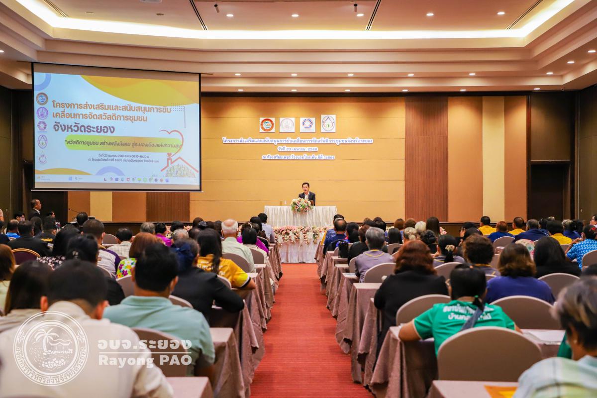 ซึ่งในโครงการดังกล่าว สถาบันพัฒนาองค์กรชุมชน(องค์การมหาชน) ได้ร่วมกับองค์การบริหารส่วนจังหวัดระยอง ขบวนองค์กรชุมชนจังหวัดระยอง และสำนักงานพัฒนาสังคมและความมั่นคงของมนุษย์จังหวัดระยอง จัดเวที “ส่งเสริมและสนับสนุนการขับเคลื่อนการจัดสวัสดิการชุมชน จังหวัดระยอง” ภายใต้แนวคิด “สวัสดิการชุมชน สร้างพลังสังคม สู่ระยองเมืองแห่งความสุข” โดยมีผู้เข้าร่วมงานกว่า 250 คน ประกอบด้วยตัวแทนองค์กรปกครองส่วนท้องถิ่น แกนนำชุมชน ภาคีเครือข่าย และหน่วยงานที่เกี่ยวข้อง ด้วยจังหวัดระยองมีนโยบายในการส่งเสริมและสนับสนุนการจัดสวัสดิการอย่างต่อเนื่อง โดยมีเป้าหมายในการสร้างชุมชนเข้มแข็งและยั่งยืน จึงมีวัตถุประสงค์ในการจัดโครงการนี้ขึ้น เพื่อสร้างพื้นที่กลางในการแลกเปลี่ยนเรียนรู้ และพัฒนาแนวทางการดำเนินงานกองทุนสวัสดิการชุมชนอย่างมีระบบและยั่งยืน โดยเน้นการสร้างความเข้าใจในหลักคิด อุดมการณ์ และเจตนารมณ์ของกองทุนสวัสดิการชุมชน