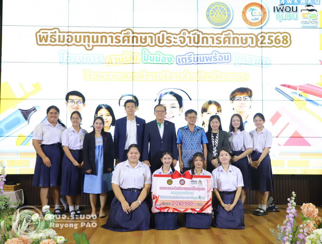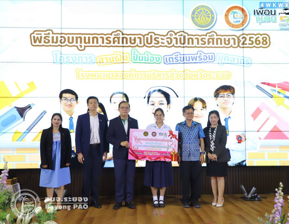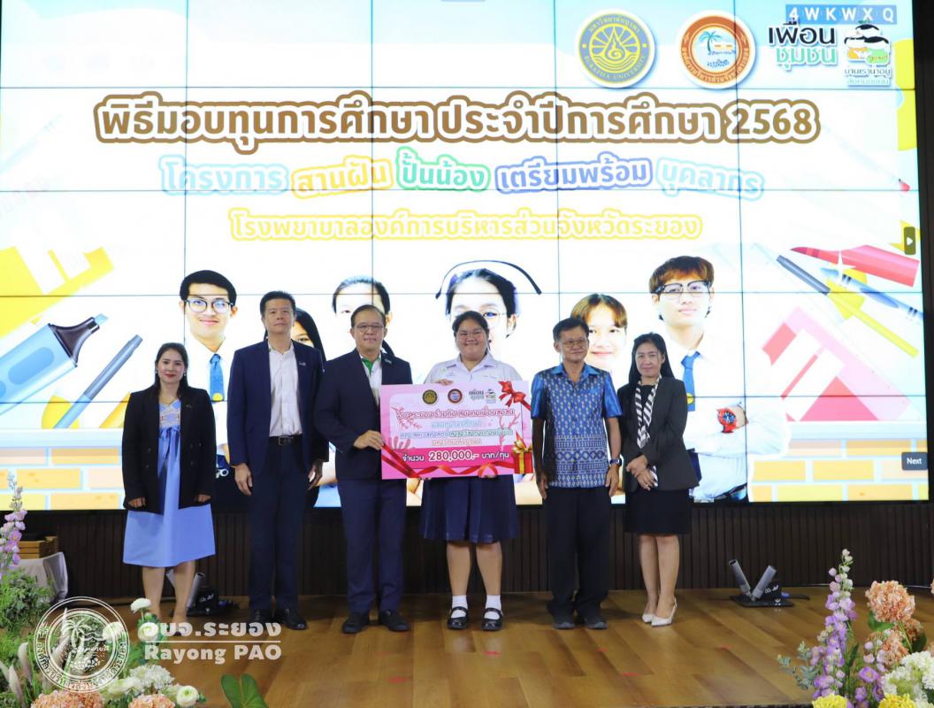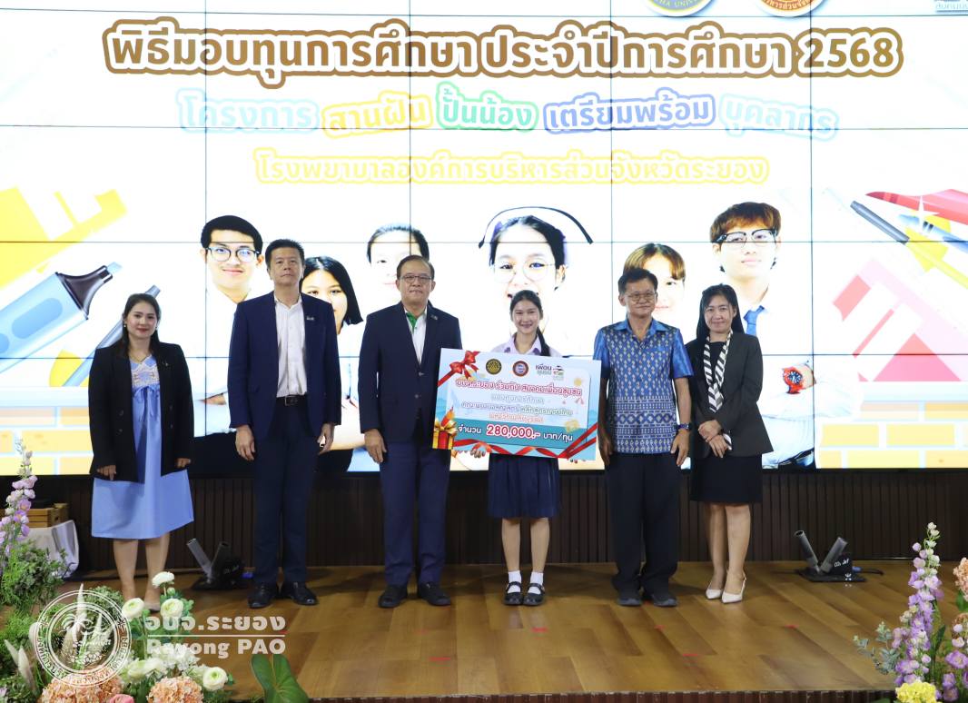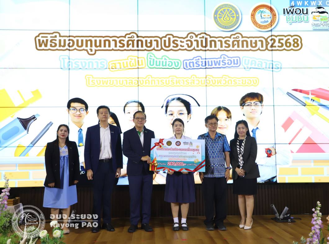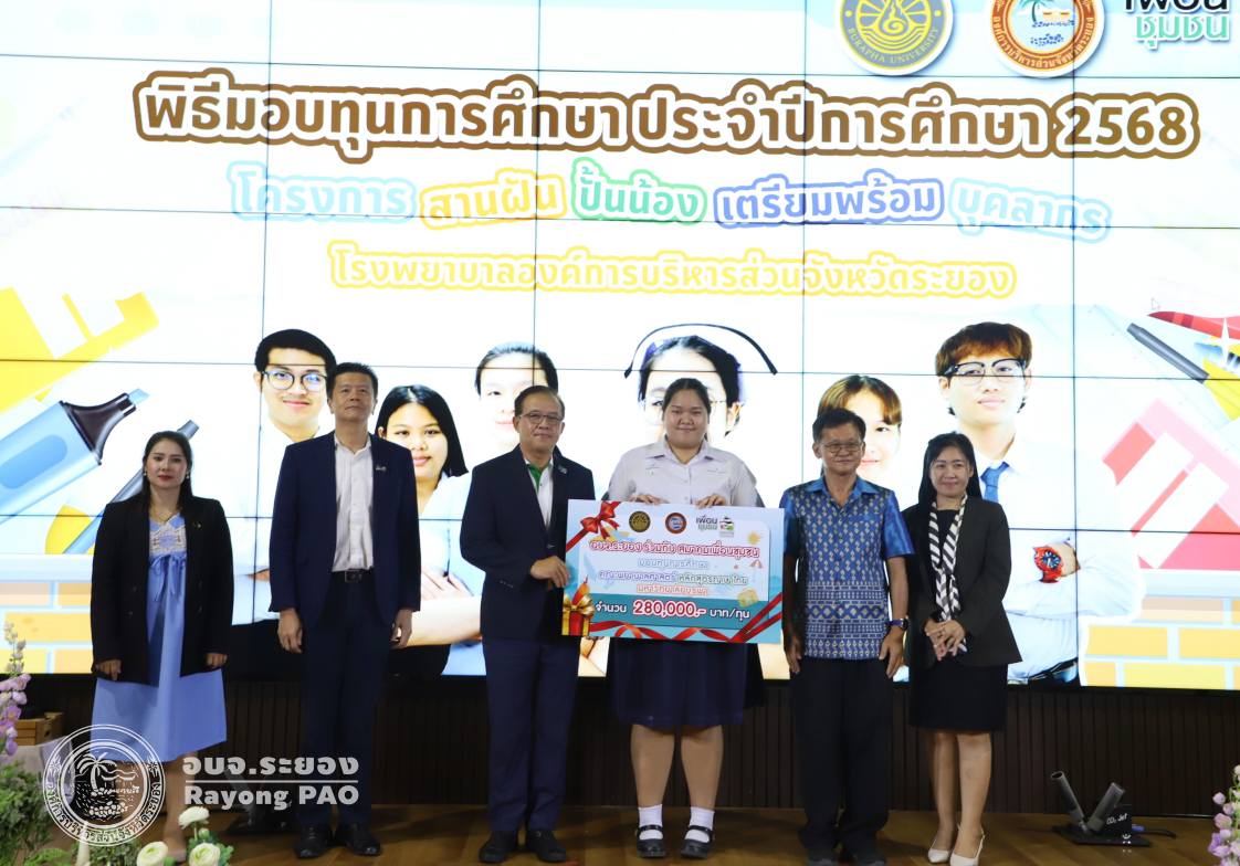 วันที่ 20 มิถุนายน 2568 เวลา 09.00 น. นายสุนทร เหรียญภูมิการกิจ ผู้เชียวชาญด้านการแพทย์และสาธารณสุข เป็นประธานเปิดโครงการสานฝัน ปั้นน้อง เตรียมพร้อมบุคลากรโรงพยาบาลองค์การบริหารส่วนจังหวัดระยอง โดยมีนางสาวอภิรดี โชติรัตน์ หัวหน้าฝ่ายบริการทางการแพทย์ เป็นผู้กล่าวรายงาน พร้อมด้วย หัวหน้าส่วนราชการ, มูลนิธิตากสินระยอง, สมาคมเพื่อนชุมชน, คณะอาจารย์ ม.บูรพา, ผู้ปกครอง และเจ้าหน้าที่ที่เกี่ยวข้อง เข้าร่วมโครงการฯ ณ อาคารปูทะเลย์มหาวิชชาลัย ศูนย์บริการการพัฒนาปลวกแดงตามพระราชดำริ จังหวัดระยอง ซึ่งทุนการศึกษาตามโครงการฯ มีจำนวนทั้งสิ้น 8 ทุน ประกอบด้วย คณะพยาบาลศาสตร์ หลักสูตรพยาบาลศาสตรบัณฑิต จำนวน 5 ทุน และคณะสหเวชศาสตร์ หลักสูตรวิทยาศาสตรบัณฑิต สาขาวิชากายภาพบำบัด จำนวน 3 ทุน พร้อมกันนี้ยังได้จัดพิธีมอบทุนการศึกษา ปีการศึกษา 2568 และพิธีปัจฉิมนิเทศนิสิตทุนที่สำเร็จการศึกษา รุ่นที่ 2 ปีการศึกษา 2564 - 2567 จำนวน 14 ทุน และนิสิตผู้ได้รับทุนจะได้รับฟังข้อตกลงและเงื่อนไขตามสัญญาการรับทุน สัญญาค้ำประกันผู้รับทุน และรับฟังหน้าที่ความรับผิดชอบของนิสิตทุน หลักการปฏิบัติตน แนะนำแนวทางการเบิกเงินทุนการศึกษา การรักษาผลการเรียน โดยผู้ดูแลนิสิตทุนฯ รวมทั้งการเตรียมความพร้อมก่อนเข้าสู่รั้วมหาวิทยาลัยในหัวข้อ "วางแผนการเรียนอย่างไรให้ประสบผลสำเร็จและมีประสิทธิภาพ" และนิสิตทุนได้เข้าพิธีบายศรีสู่ขวัญ ซึ่งได้รับเกียรติจากคณะผู้บริหารร่วมผูกข้อมือในพิธีบายศรีสู่ขวัญครั้งนี้ด้วย