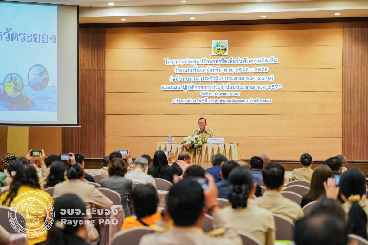 วันที่ 23 มิถุนายน 2568 เวลา 09.30 น. นายภาคภูมิ สุวรรณโชติ หัวหน้าฝ่ายยุทธศาสตร์และแผนงาน สำนักยุทธศาสตร์และงบประมาณ พร้อมด้วย ข้าราชการ อบจ.ระยอง และผู้ที่เกี่ยวข้องเข้าร่วมพิธีเปิดโครงการประชุมปรึกษาหารือเพื่อรับฟังความคิดเห็นร่างแผนพัฒนาจังหวัด พ.ศ. 2566-2570 (ฉบับทบทวน ประจำปีงบประมาณ พ.ศ. 2570) และแผนปฏิบัติราชการประจำปีงบประมาณ พ.ศ. 2570 โดยมี นายกัฬชัย เทพวรชัย รองผู้ว่าราชการจังหวัดระยอง เป็นประธานเปิดโครงการฯ ซึ่งโครงการดังกล่าวจัดขึ้นเพื่อเป็นการนำเสนอร่างเป้าหมายการพัฒนาจังหวัดระยอง 20 ปี (พ.ศ.2571-2575) การบรรยายให้ความรู้เกี่ยวกับการจัดทำงบประมาณรายจ่ายตามแผนปฏิบัติราชการประจำปีของจังหวัดและกลุ่มจังหวัด และแนวทางการจัดทำคำของบประมาณ โดยสำนักงานงบประมาณเขตที่ 1 รวมถึงการนำเสนอร่างแผนพัฒนาจังหวัด พ.ศ.2566-2570 (ฉบับทบทวน ประจำปีงบประมาณ พ.ศ.2570) และแผนปฏิบัติราชการประจำปีงบประมาณ พ.ศ.2570 ณ ห้องสร้อยเพชร โรงแรมโกลเด้นซิตี้ ระยอง อำเภอเมืองระยอง จังหวัดระยอง