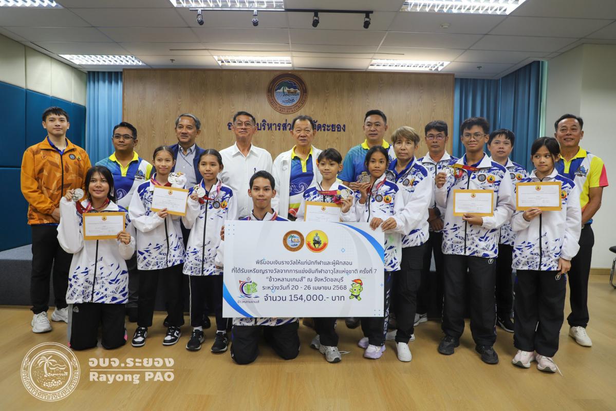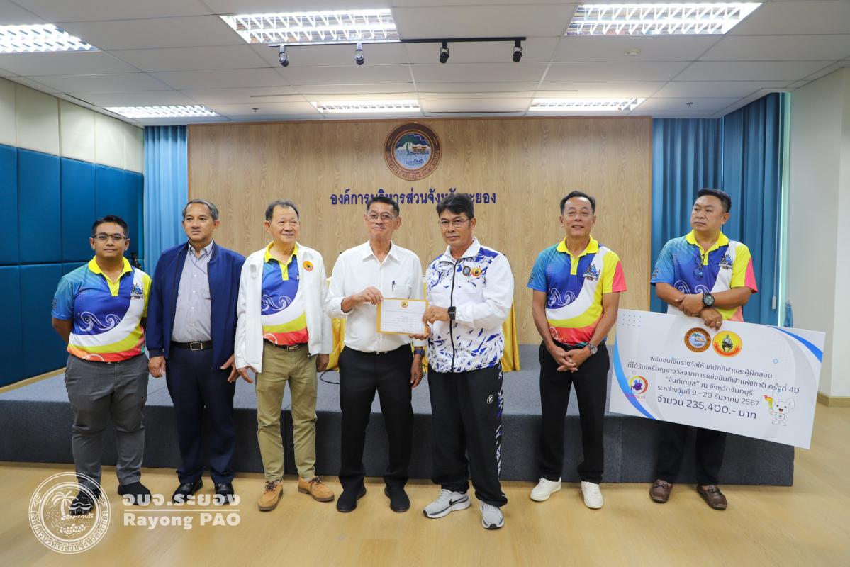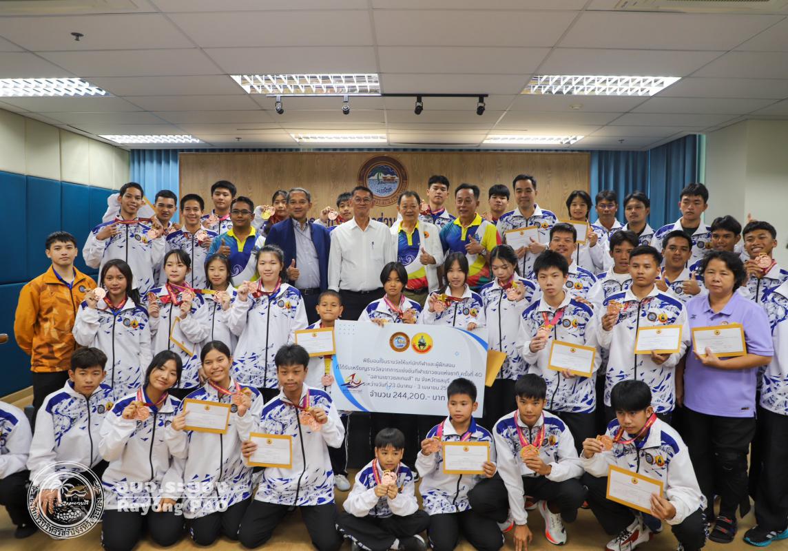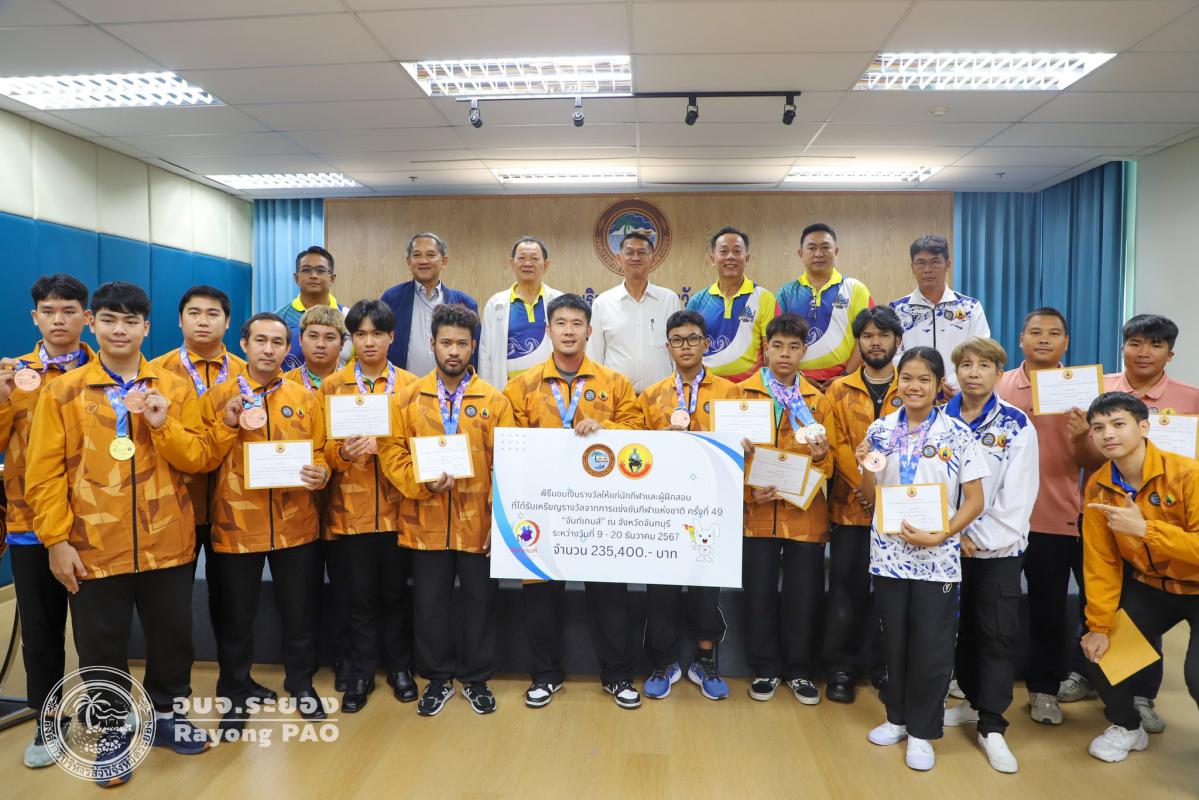 วันที่ 17 กรกฎาคม 2568 เวลา 14.00 น. นายปิยะ ปิตุเตชะ นายกองค์การบริหารส่วนจังหวัดระยอง เป็นประธานในพิธีมอบเงินค่าเหรียญรางวัลให้กับนักกีฬาและผู้ฝึกสอน พร้อมด้วย นายวิเชียร แสงวงศ์กิจ นายกสมาคมกีฬาแห่งจังหวัดระยอง นายประสาต์ พฤกษาชาติ รองนายกอบจ.ระยอง (2) นายพายัพ ผ่องใส เลขานุการนายกอบจ.ระยอง นายมนัส สมศักดิ์ สมาชิกสภาอบจ.ระยอง เขต 1 อำเภอวังจันทร์ และเจ้าหน้าที่ที่เกี่ยวข้อง เข้าร่วมพิธีดังกล่าวอย่างพร้อมเพรียงกัน เพื่อเป็นการเชิดชูเกียรติและร่วมแสดงความยินดีกับนักกีฬาที่สร้างชื่อเสียงให้จังหวัดระยอง ที่เข้าร่วมแข่งขันกีฬาเยาวชนแห่งชาติ ครั้งที่ 40 จังหวัดชลบุรี กีฬาแห่งชาติ ครั้งที่ 49 จังหวัดจันทบุรี กีฬาคนพิการแห่งชาติ ครั้งที่ 39 จังหวัดจันทบุรี และกีฬาอาวุโสแห่งชาติ ครั้งที่ 7 จังหวัดชลบุรี ณ ห้องประชุม 1 ชั้น 3 อบจ.ระยอง