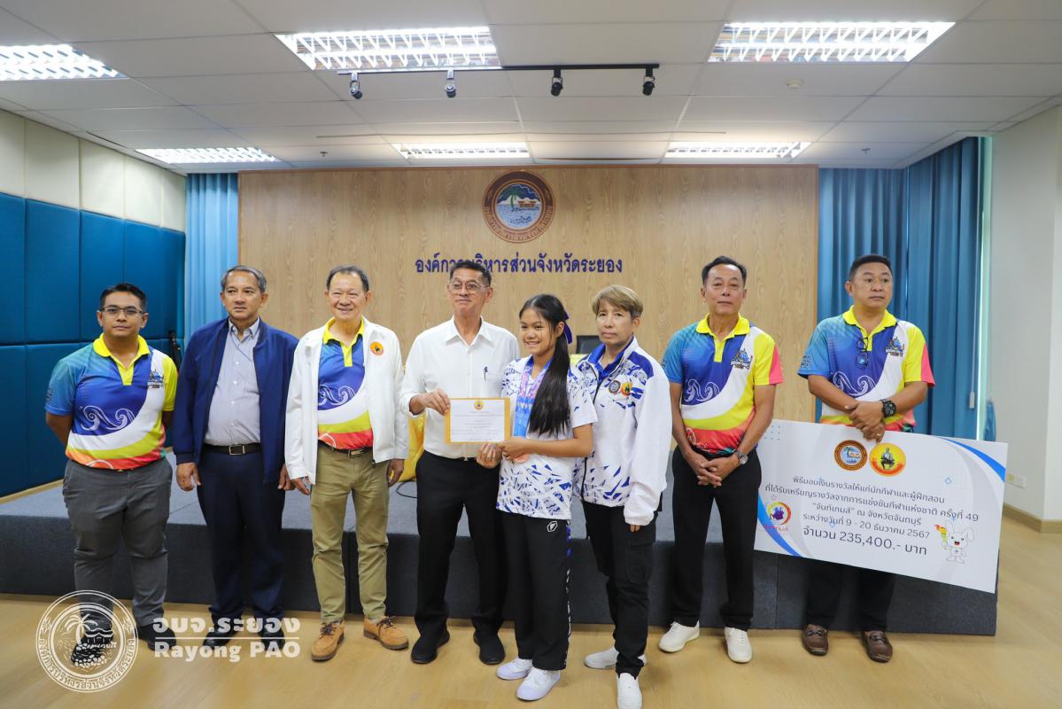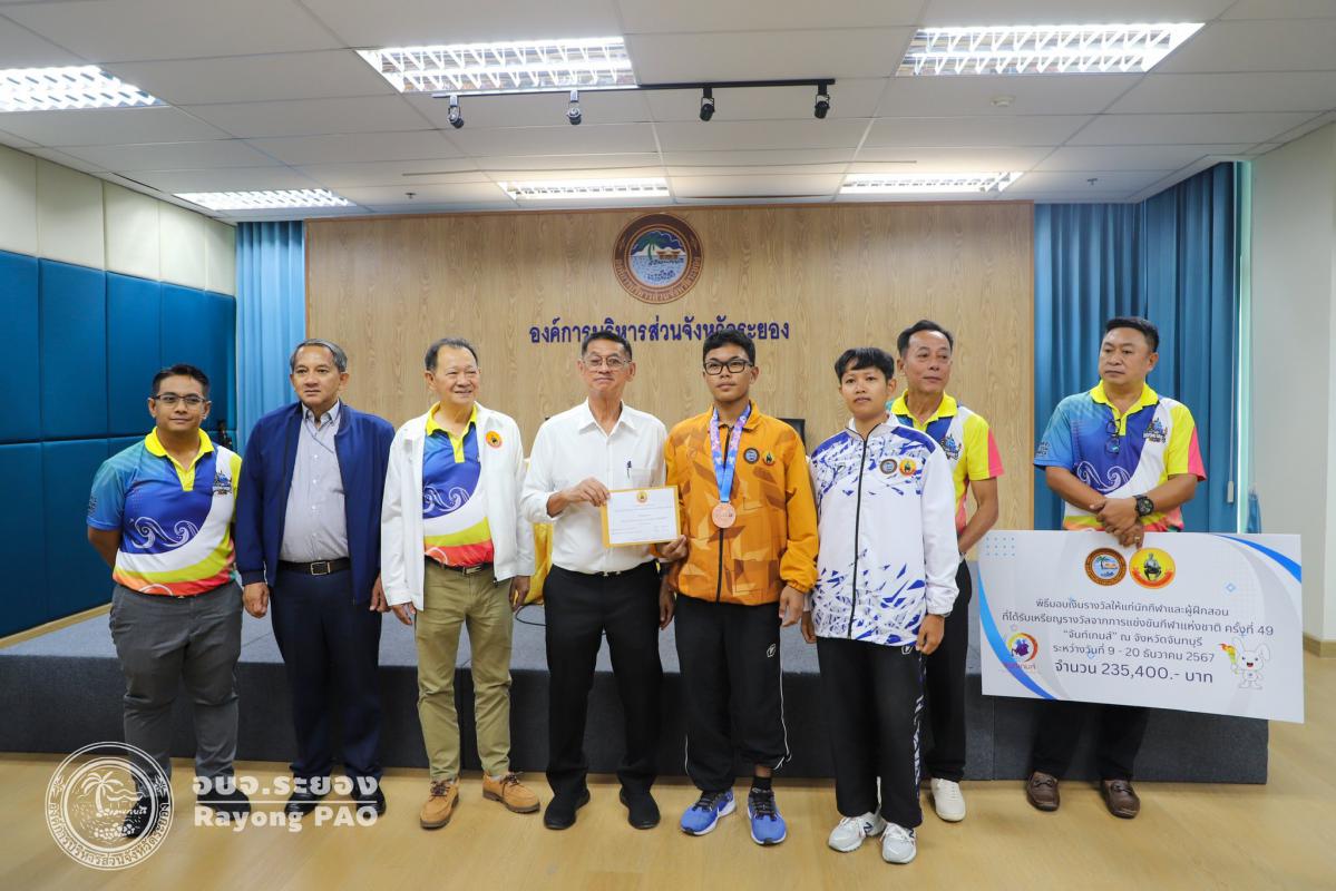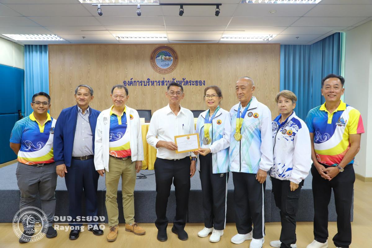 วันที่ 17 กรกฎาคม 2568 เวลา 14.00 น. นายปิยะ ปิตุเตชะ นายกองค์การบริหารส่วนจังหวัดระยอง เป็นประธานในพิธีมอบเงินค่าเหรียญรางวัลให้กับนักกีฬาและผู้ฝึกสอน พร้อมด้วย นายวิเชียร แสงวงศ์กิจ นายกสมาคมกีฬาแห่งจังหวัดระยอง นายประสาต์ พฤกษาชาติ รองนายกอบจ.ระยอง (2) นายพายัพ ผ่องใส เลขานุการนายกอบจ.ระยอง นายมนัส สมศักดิ์ สมาชิกสภาอบจ.ระยอง เขต 1 อำเภอวังจันทร์ และเจ้าหน้าที่ที่เกี่ยวข้อง เข้าร่วมพิธีดังกล่าวอย่างพร้อมเพรียงกัน เพื่อเป็นการเชิดชูเกียรติและร่วมแสดงความยินดีกับนักกีฬาที่สร้างชื่อเสียงให้จังหวัดระยอง ที่เข้าร่วมแข่งขันกีฬาเยาวชนแห่งชาติ ครั้งที่ 40 จังหวัดชลบุรี กีฬาแห่งชาติ ครั้งที่ 49 จังหวัดจันทบุรี กีฬาคนพิการแห่งชาติ ครั้งที่ 39 จังหวัดจันทบุรี และกีฬาอาวุโสแห่งชาติ ครั้งที่ 7 จังหวัดชลบุรี ณ ห้องประชุม 1 ชั้น 3 อบจ.ระยอง