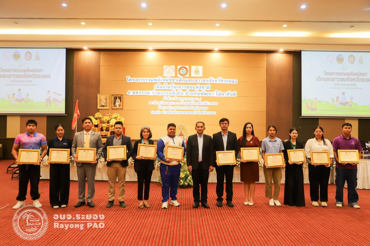 วันที่ 9 กันยายน 2568 เวลา 08.30 น. องค์การบริหารส่วนจังหวัดระยอง ร่วมกับบ้านพักเด็กและครอบครัวจังหวัดระยอง จัดโครงการรวมพลังสมัชชาเด็กและเยาวชนจังหวัดระยอง เนื่องในวันเยาวชนแห่งชาติ 4 ทศวรรษ ร่วมแรงแข็งขัน ช่วยกันพัฒนา ใฝ่หาสันติ เพื่อส่งเสริม สนับสนุน ให้เด็กและเยาวชนได้แสดงความคิดเห็นแสดงออก และประเมินเรื่องที่มีผลกระทบต่อเด็กและเยาวชนในเขตพื้นที่จังหวัดระยองเพื่อส่งต่อข้อมูลดังกล่าวให้กับหน่วยงานที่เกี่ยวข้องต่อไป โดยมีนายประสานต์ พฤกษาชาติ รองนายกองค์การบริหารส่วนจังหวัดระยอง (2) เป็นประธานในพิธีเปิดโครงการฯ พร้อมด้วยนางสาวสุประวีณ์ สาวงษ์ รองปลัดอบจ.ระยอง รักษาราชการแทน ผู้อำนวยการกองการศึกษา ศาสนาและวัฒนธรรม ซึ่งภายหลังจากเสร็จสิ้นกิจกรรมได้รับเกียรติจากนางสาวสลารีวรรณ ทัพทวี รองผู้ว่าราชการจังหวัดระยอง กล่าวให้โอวาทและเป็นประธานปิดโครงการฯ ณ โรงแรมโกลเด้น ซิตี้ ระยอง