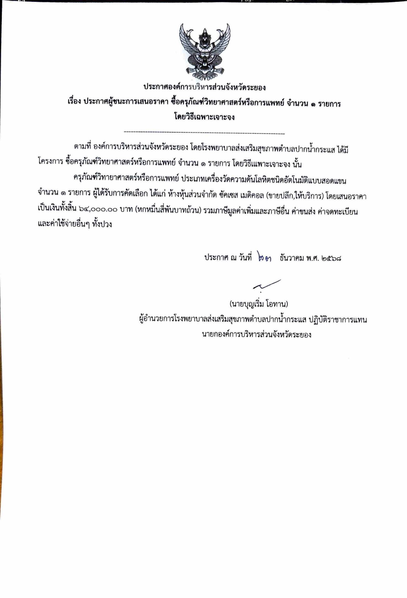 ประกาศผู้ชนะการเสนอราคา ซื้อครุภัณฑ์วิทยาศาสตร์หรือการแพทย์ จำนวน 1 รายการ โดยวิธีเฉพาะเจาะจง