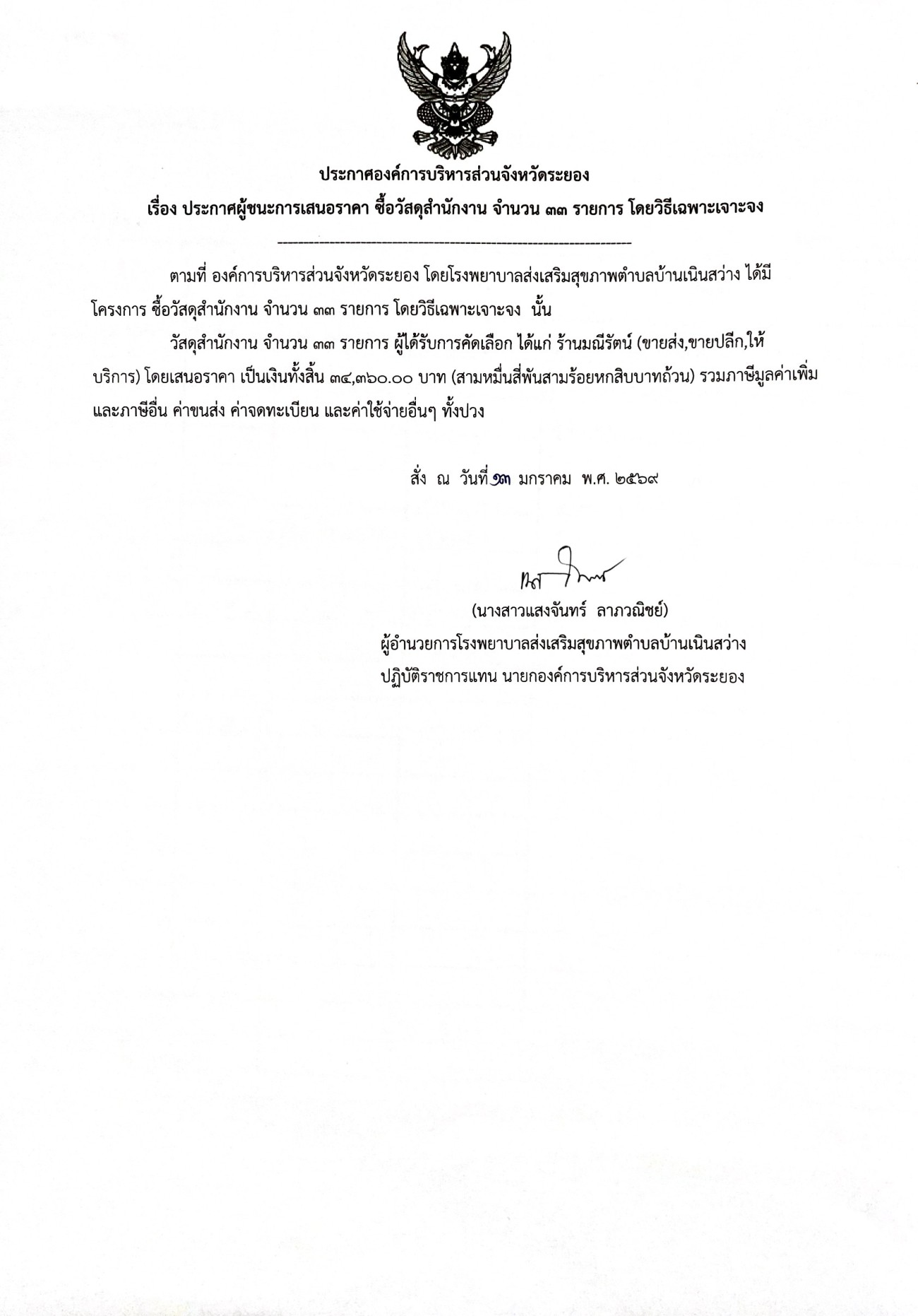 ประกาศผู้ชนะการเสนอราคา ซื้อวัสดุสำนักงาน จำนวน 13 รายการ โดยวิธีเฉพาะเจาะจง