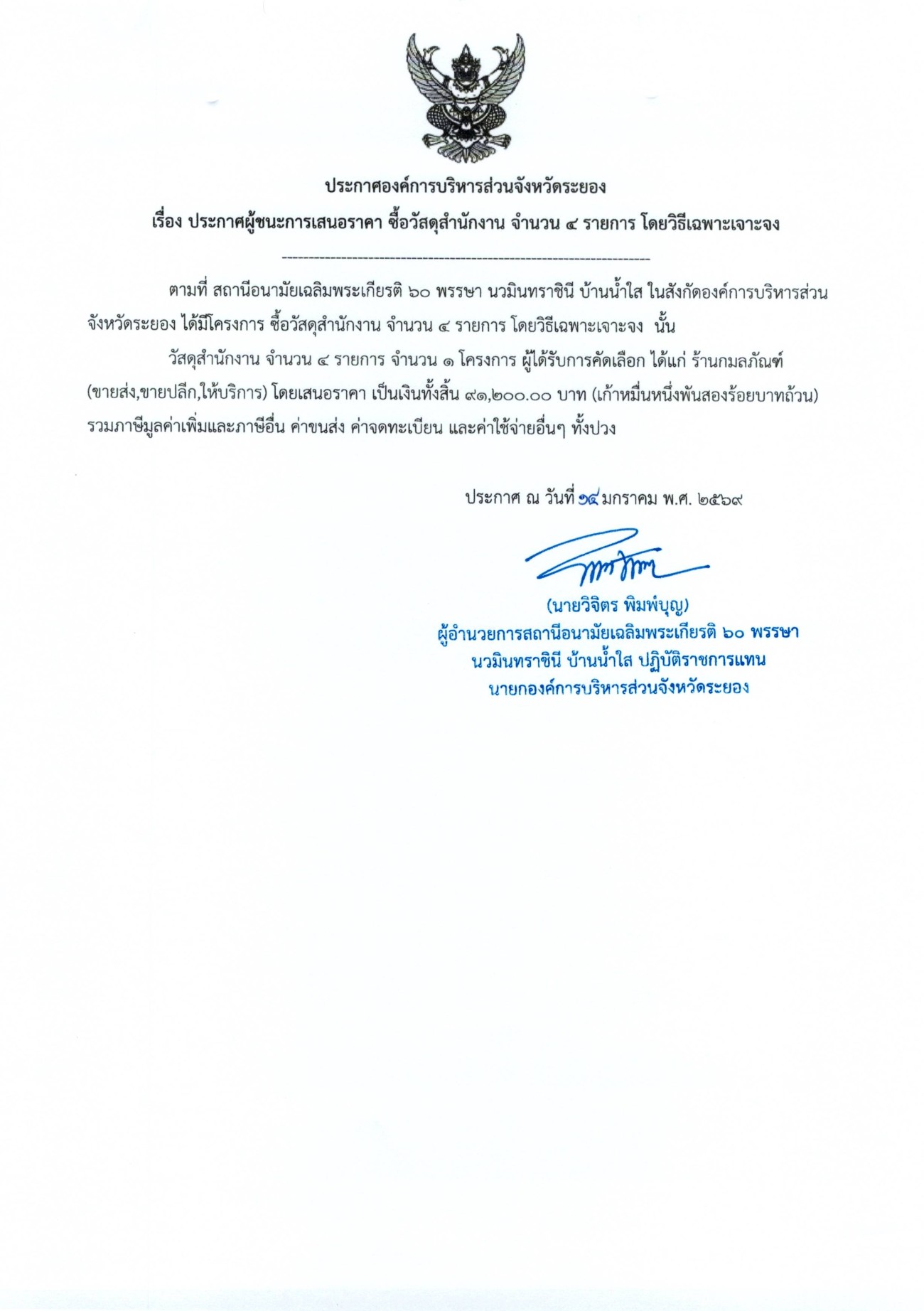ประกาศองค์การบริหารส่วนจังหวัดระยอง เรื่อง ประกาศผู้ชนะการเสนอราคา ซื้อวัสดุสำนักงาน จำนวน ๔ รายการ โดยวิธีเฉพาะเจาะจง