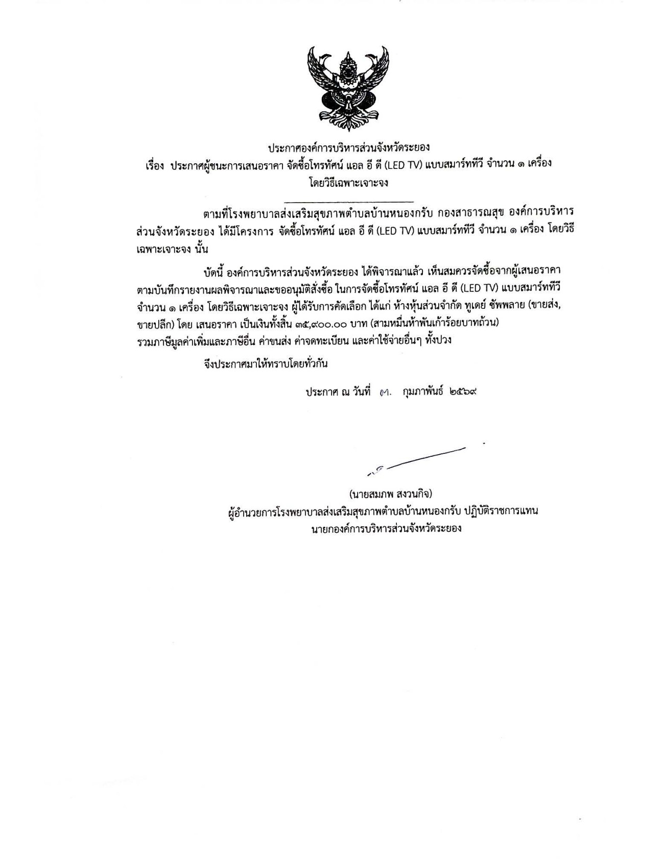 ประกาศผู้ชนะการเสนอราคา จัดซื้อโทรทัศน์ แอล อี ดี (LED TV) แบบสมาร์ททีวี จำนวน 1 เครื่อง โดยวิธีเฉพาะเจาะจง