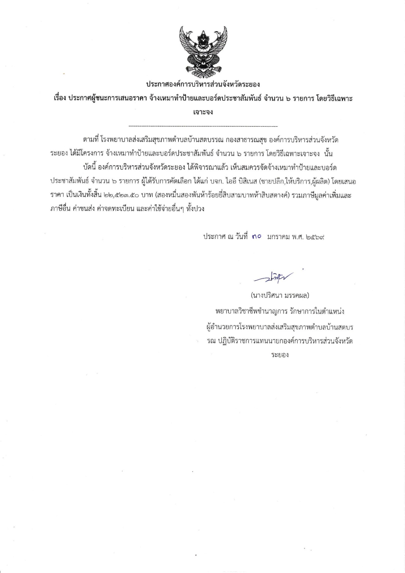 ประกาศผู้ชนะการเสนอราคา จ้างเหมาทำป้ายและบอร์ดประชาสัมพันธ์ จำนวน 6 รายการ โดยวิธีเฉพาะเจาะจง
