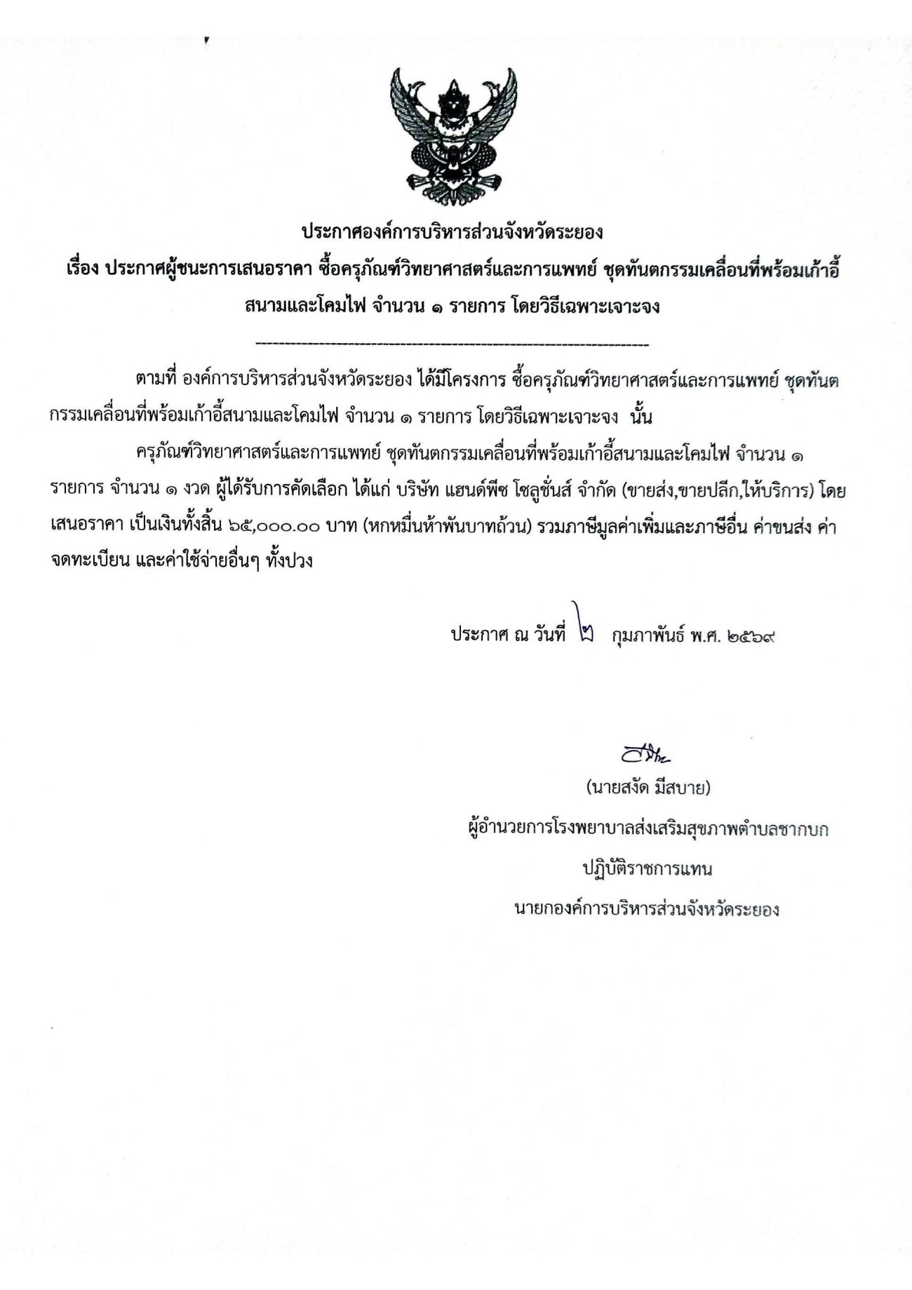 ประกาศผู้ชนะการเสนอราคา ซื้อครุภัณฑ์วิทยาศาสตร์และการแพทย์ ชุดทันตกรรมเคลื่อนที่พร้อมเก้าอี้สนามและโคมไฟ จำนวน 1 รายการ โดยวิธีเฉพาะเจาะจง