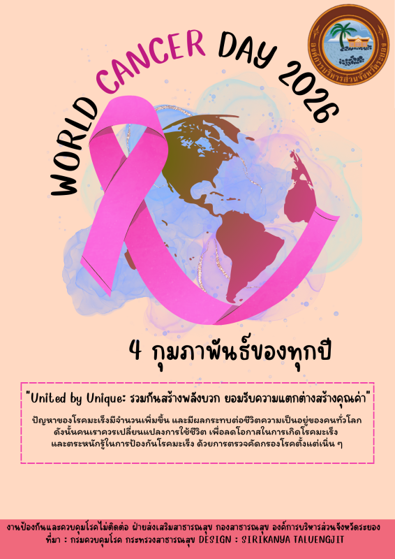 ด้วยกองสาธารณสุข ได้จัดทำสื่อประชาสัมพันธ์วันมะเร็งโลก ประจำปี พ.ศ. ๒๕๖๙ (World Cancer Day ๒๐๒๖) เพื่อประชาสัมพันธ์ให้ประชาชนทั่วไป ได้ตระหนักถึงความสำคัญของวันมะเร็งโลก การป้องกัน การตรวจหา การรักษา และสาเหตุของโรคมะเร็ง เป้าหมายหลัก คือ การให้ความรู้ว่าโรคมะเร็งสามารถป้องกันได้ และเน้นย้ำถึงความสำคัญของการสังเกตอาการ การตรวจหาตั้งแต่ระยะเริ่มต้น และการเข้ารับการรักษาทางการแพทย์อย่างทันท่วงที รายละเอียดตามเอกสารที่แนบมาพร้อมนี้