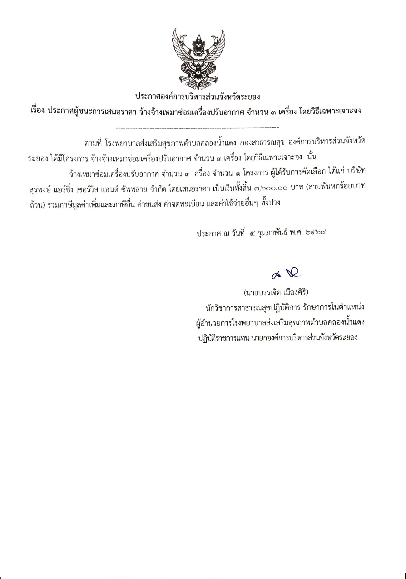ประกาศผู้ชนะการเสนอราคา จ้างเหมาซ่อมเครื่องปรับอากาศ จำนวน 3 เครื่อง โดยวิธีเฉพาะเจาะจง