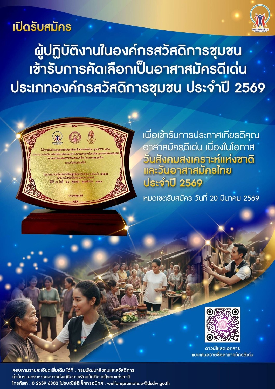 การรับสมัครเข้ารับการพิจารณาคัดเลือกอาสามสมัครดีเด่น ประเภทองค์กรสวัสดิการชุมชน ประจำปี ๒๕๖๙