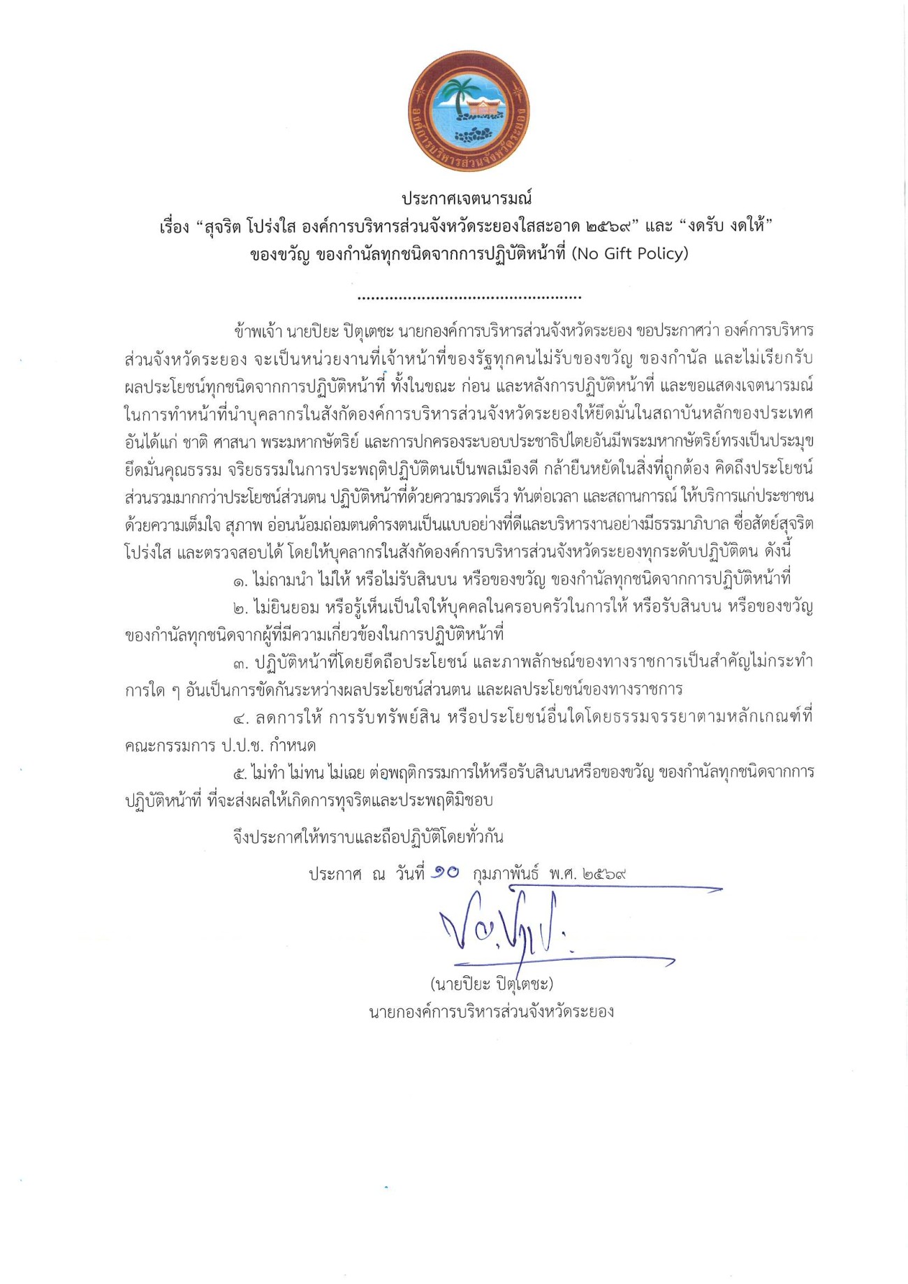 ประกาศเจตนารมณ์ เรื่อง "สุจริต โปร่งใส องค์การบริหารส่วนจังหวัดระยองใสสะอาด ๒๕๖๙" และ "งดรับ งดให้" ของขวัญ ของกำนัลทุกชนิดจากการปฏิบัติหน้าที่ (No Gift Policy)
