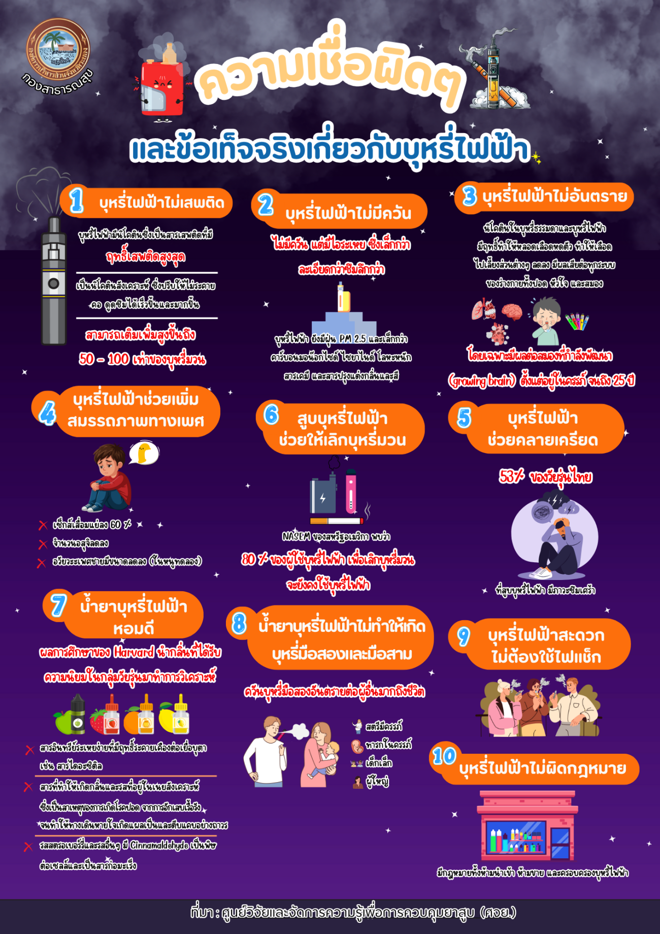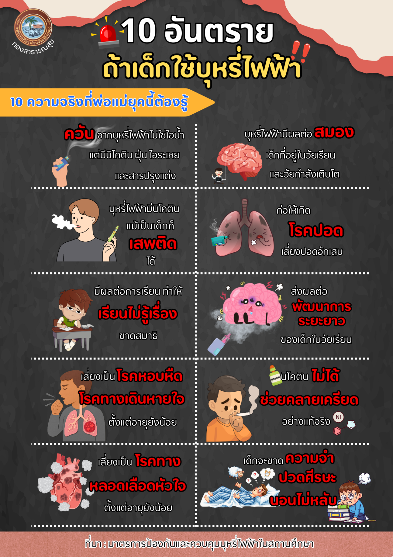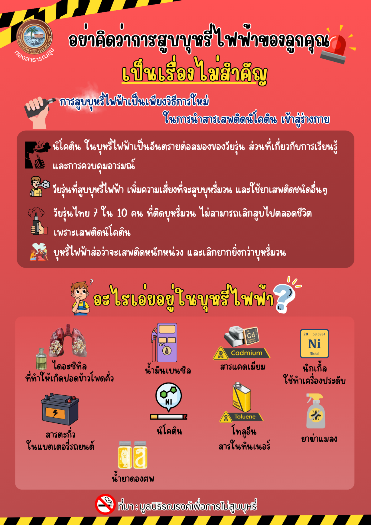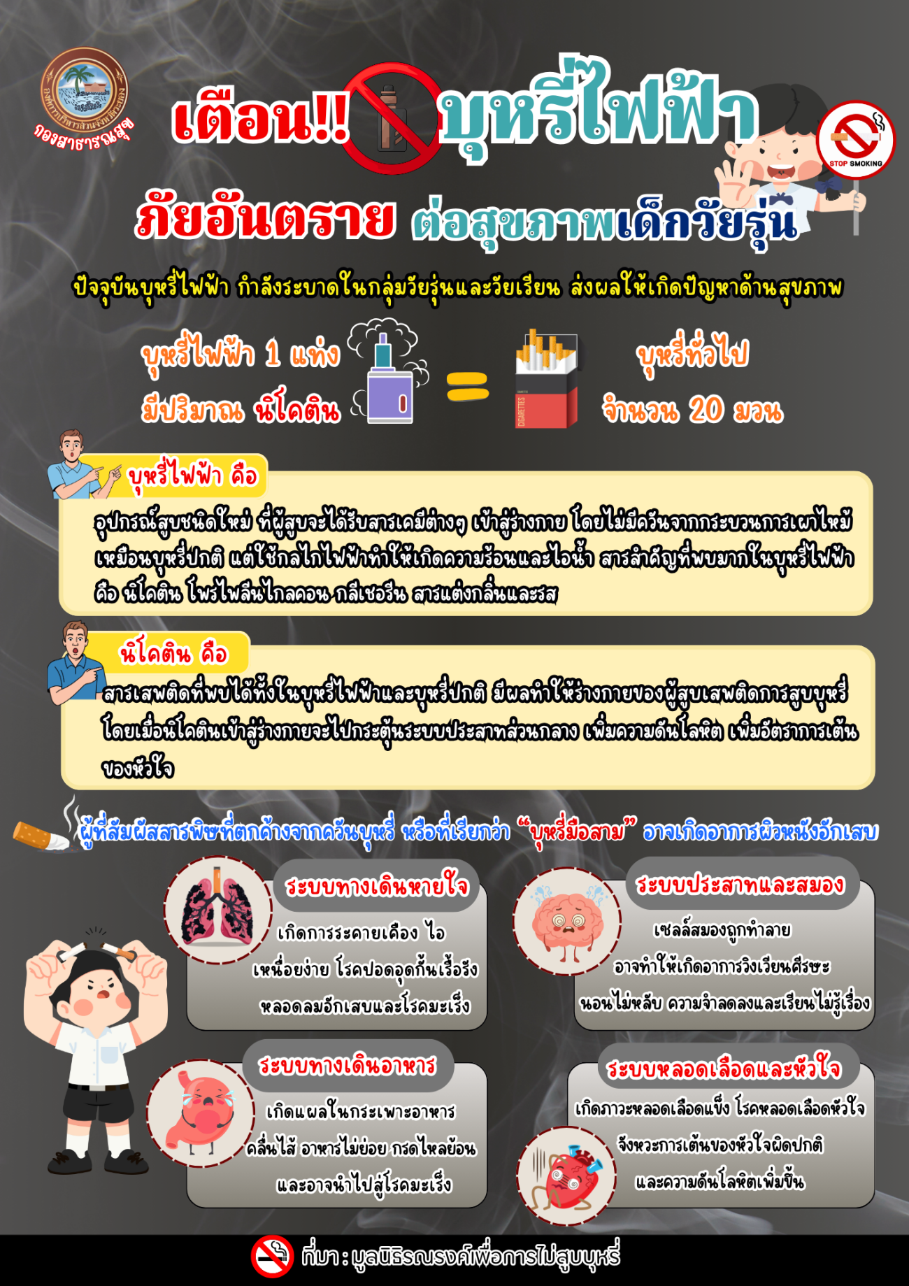 ด้วยกองสาธารณสุข ได้จัดทำสื่อประชาสัมพันธ์เตือนภัย อันตรายจากบุหรี่ไฟฟ้า เพื่อประชาสัมพันธ์ให้นักเรียน นักศึกษา และประชาชนทั่วไป ได้ตระหนักถึงโทษ พิษภัย อันตราย และผลกระทบของการสูบบุหรี่ไฟฟ้า และเพื่อให้วัยรุ่นได้รับความรู้ที่ถูกต้องเกี่ยวกับโทษของบุหรี่ไฟฟ้า รวมถึงคำแนะนำสำหรับผู้ปกครองในการสังเกต เฝ้าระวัง พูดคุยแนะนำ หรือให้ความรู้ที่ถูกต้องแก่บุตรหลานในครอบครัว ทำให้เด็กและเยาวชนมีการสร้างเกราะป้องกันตนเองจากบุหรี่ไฟฟ้า รายละเอียดตามเอกสารที่แนบมาพร้อมนี้