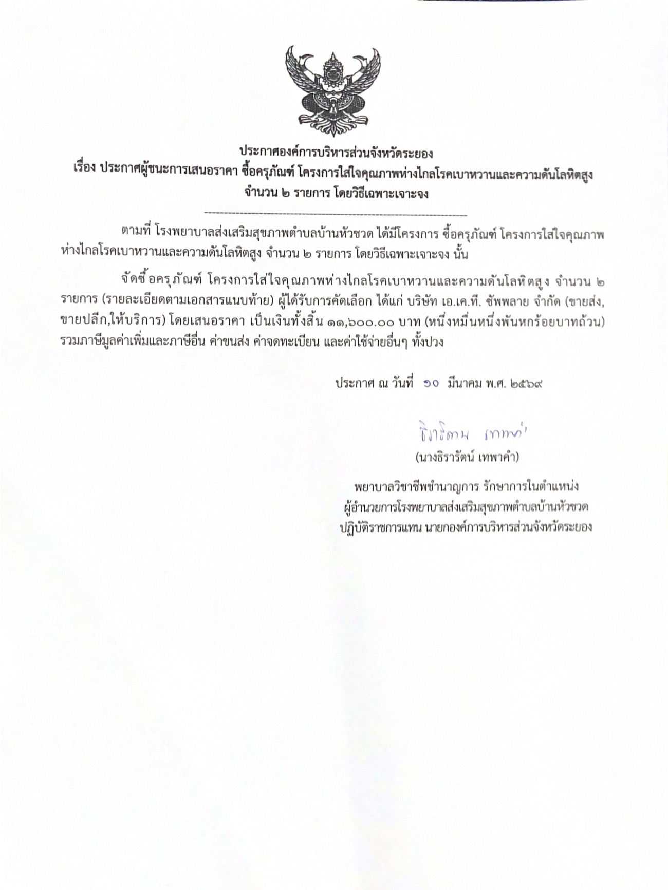 ประกาศผู้ชนะเสนอราคา ซื้อครุภัณฑ์ โครงการใส่ใจคุณภาพห่างไกลโรคเบาหวานและความดันโลหิตสูง จำนวน 2 รายการ โดยวิธีเฉพาะเจาะจง